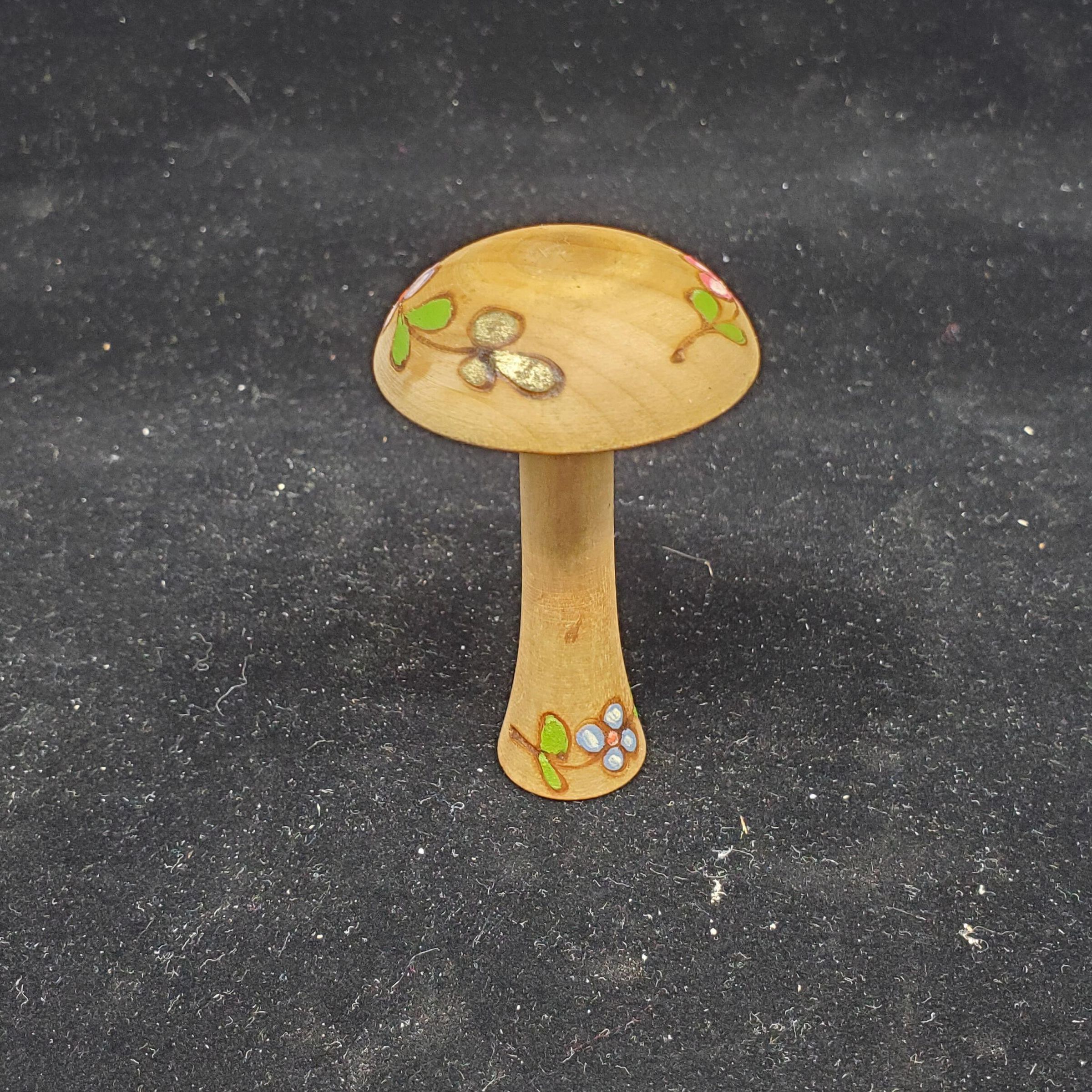 Small light coloured wooden darner and needle holder. Pull off top. Mushroom shaped top with painted flowers around outside. Pink, white, blue flowers with green leaves, some also at base of stem. Center top stem has hole with needles. Made in Scotland.