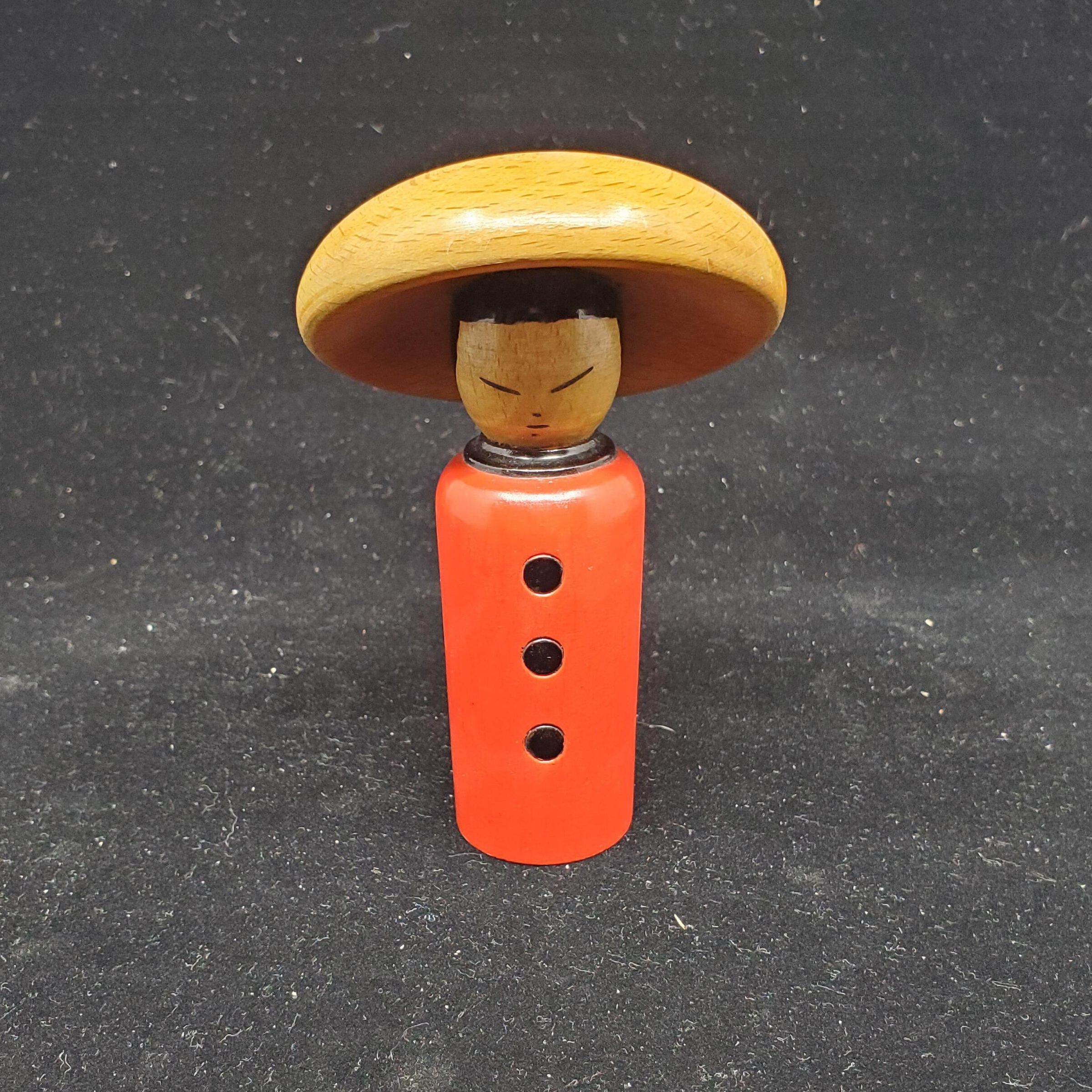 Wooden darner. Light tan coloured wood,mushroom type darner. in shape of Oriental . Top is mushroom shaped hat with Oriental face below - black hair and face features. Body is stem of mushroom , painted bright red with black collar and 3 black buttons.