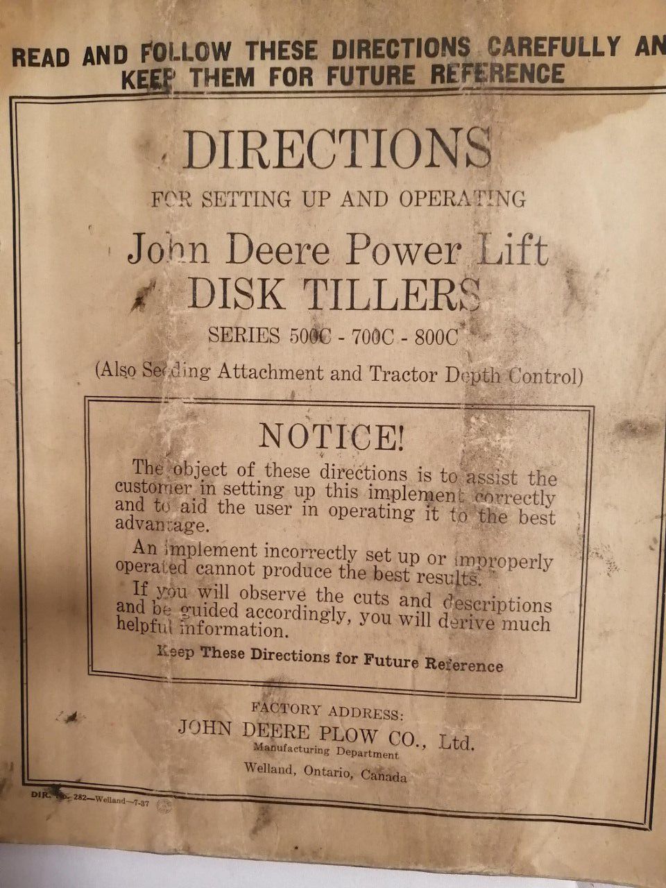 Directions for setting up and operating John Deer power lift disk tillers. Series 500C - 700C - 800C. (Also seeding attachment and tractor depth control).