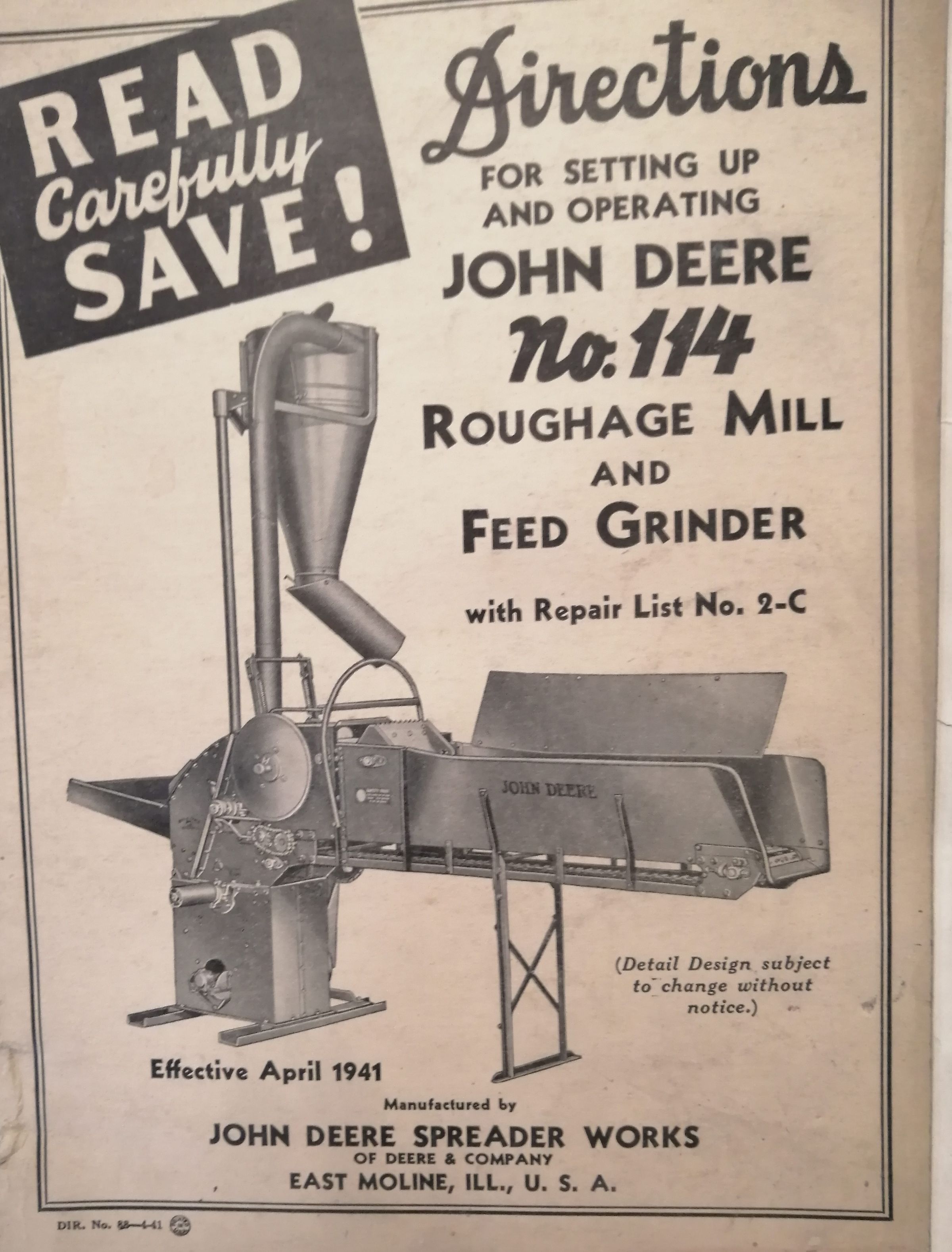 Directions for setting up and operating John Deere No. 114 roughage mill and feed grinder. With repair list No 2-C