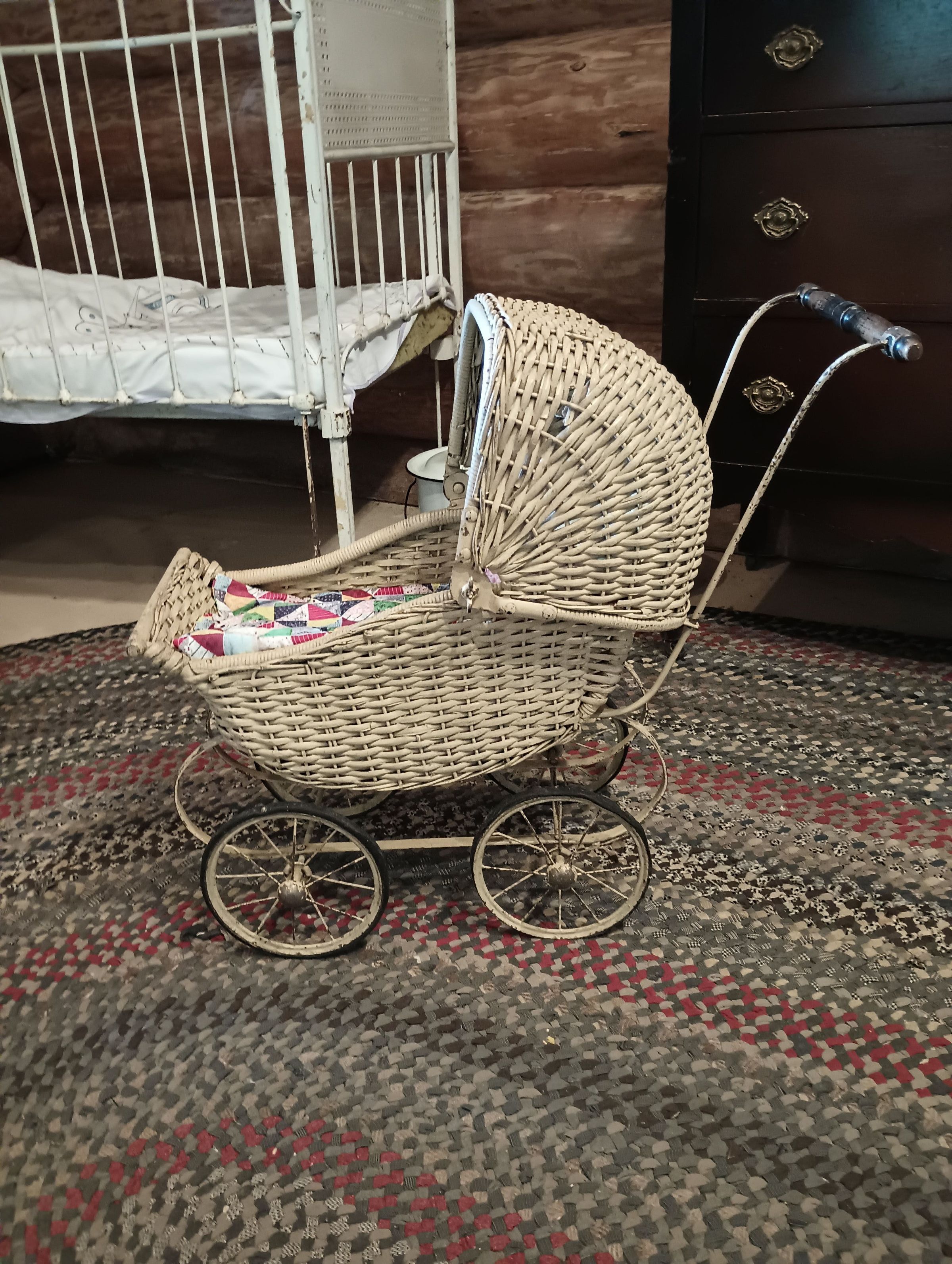 Wicker doll carriage with metal frame and wooden handle.