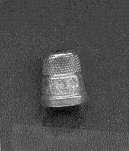 Sterling silver thimble with plain raised band at rim with English hallmarks, Wide band of chrysanthenum pattern above - one flower high, then knurling to and over top. Top of thimble is gouged - looks like it has been repaired from inside. Hallmarks - Chester 1910 size 6 Maker CH (Charles Horner).