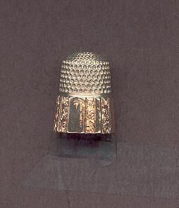 Sterling silver thimble with wide gold band. Band is panelled, every other one plain, others pattrerned. The name Elsie is written vertically on one panel. Patent May 28 Ô89 and 7 (size) are stamped on a plain panel Cut leaf pattern on alternating panels. Faint trace of all over gold wash on knurling.