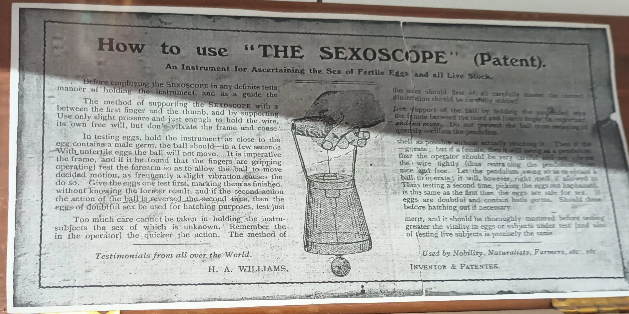 Metal, glass and wood device. Falsely claims to use a hanging ball to assess the fertility of eggs.Use