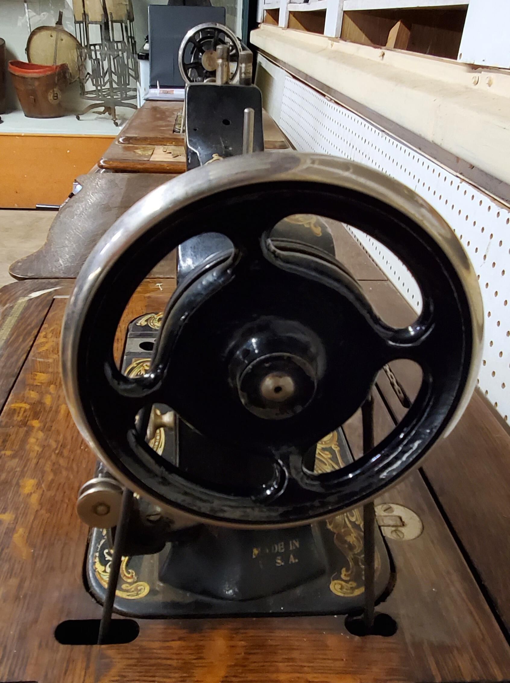 Eldredge treadle sewing machine, Serial #23881085 in cabinet. Manufactured by the National Sewing Machine Company c. 1900.