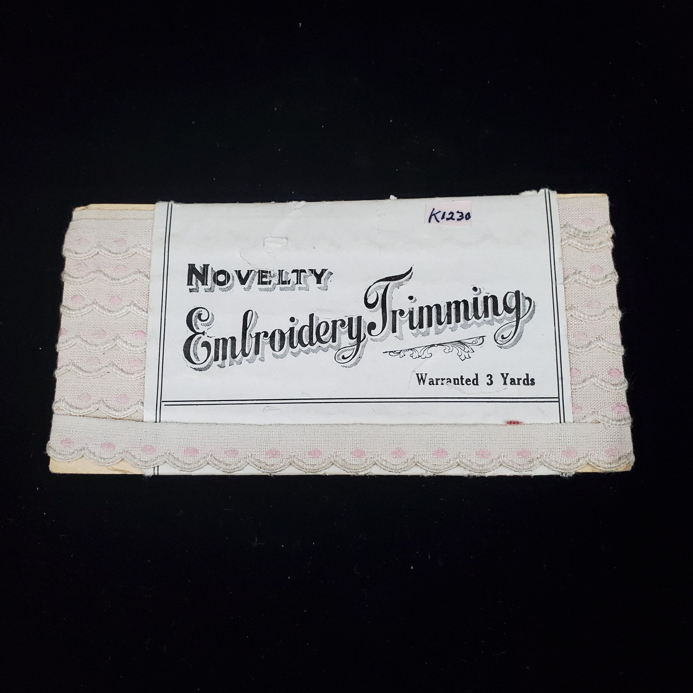 Packet of trimming with original price tag of 10 cents from Hudson Bay Co. on back. 3 yards white scalloped edging with pink in each scallop.Paper wrapper reads ÒNovelty Embroidery Trimming Warranted 3 YardsÓ
