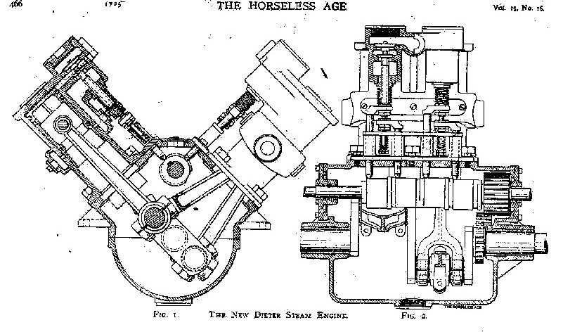 The following illustration and description of the Dieter engine appeared in THE HORSELESS AGE vol. 15 #16, 1905, p. 446. This description pertains to a 4-cylinder version of the engine, with slightly smaller bore and stroke than the 3-cylinder version, but the mechanical construction is very similar to the engine described above.