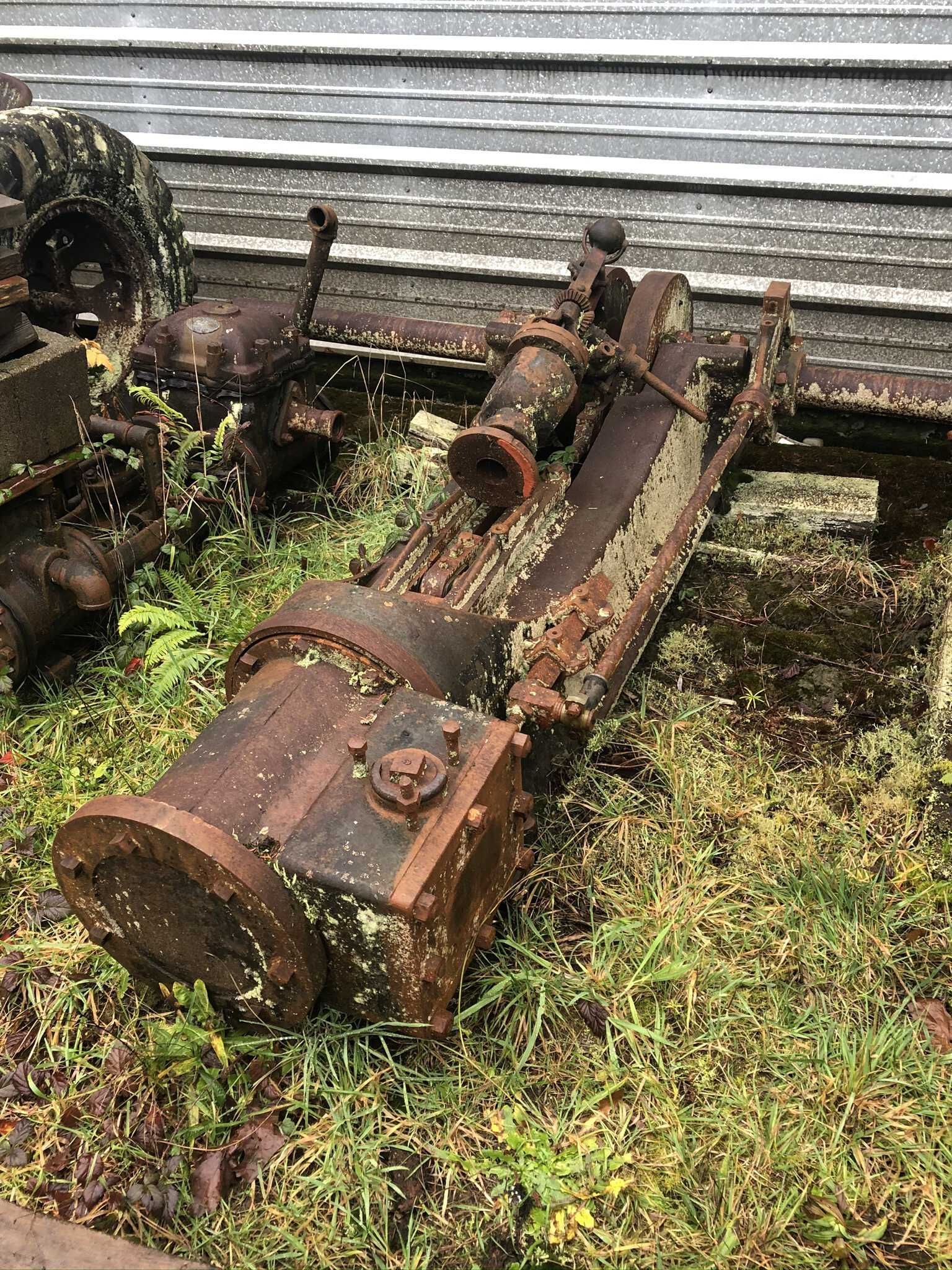 Horizontal slide valve steam engine, flywheel missing, unrestored. From BC Museum
