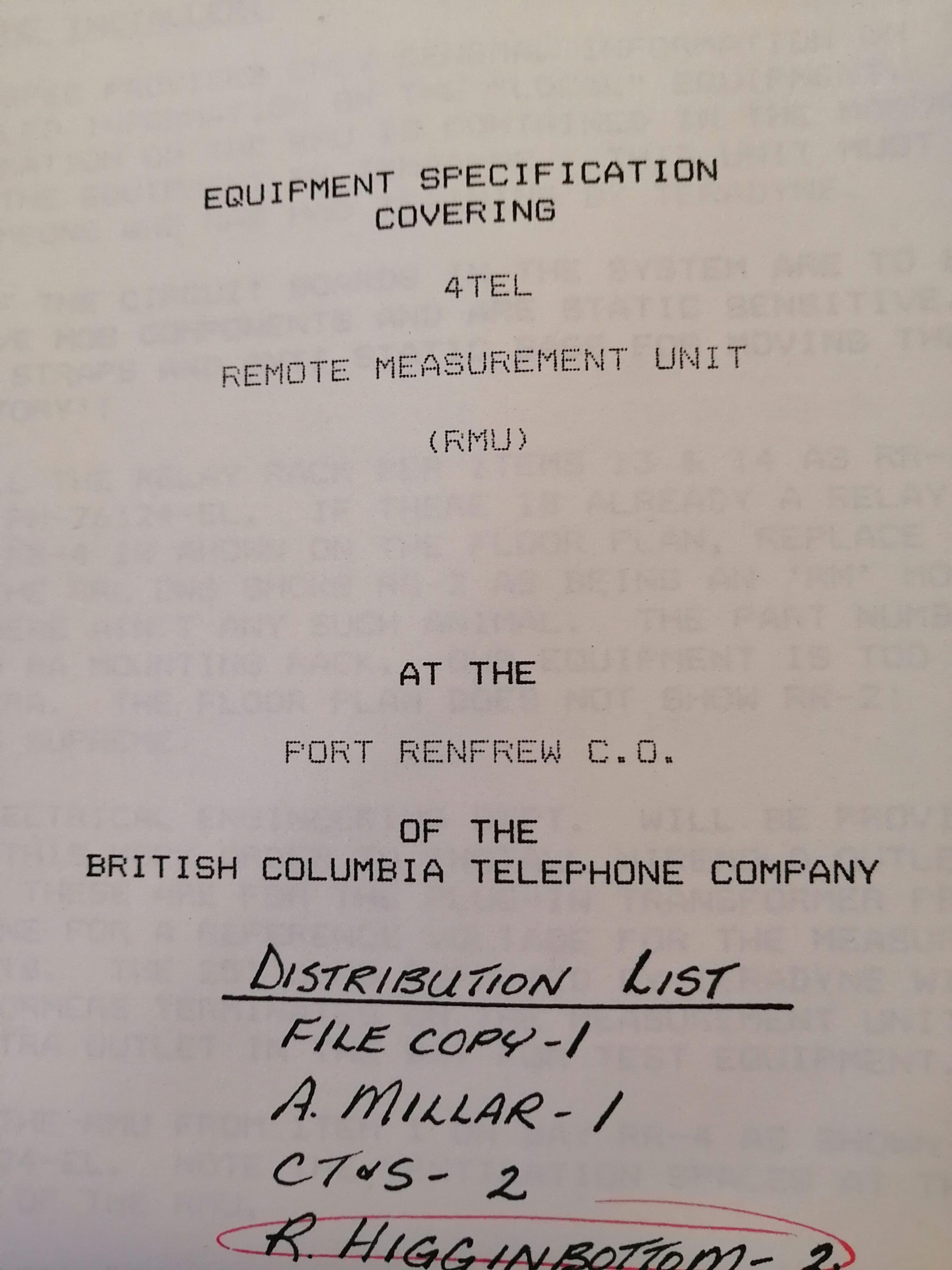 Equipment specification covering 4Tel remote measurement unit (RMU) at the Fort Renfrew C.O.