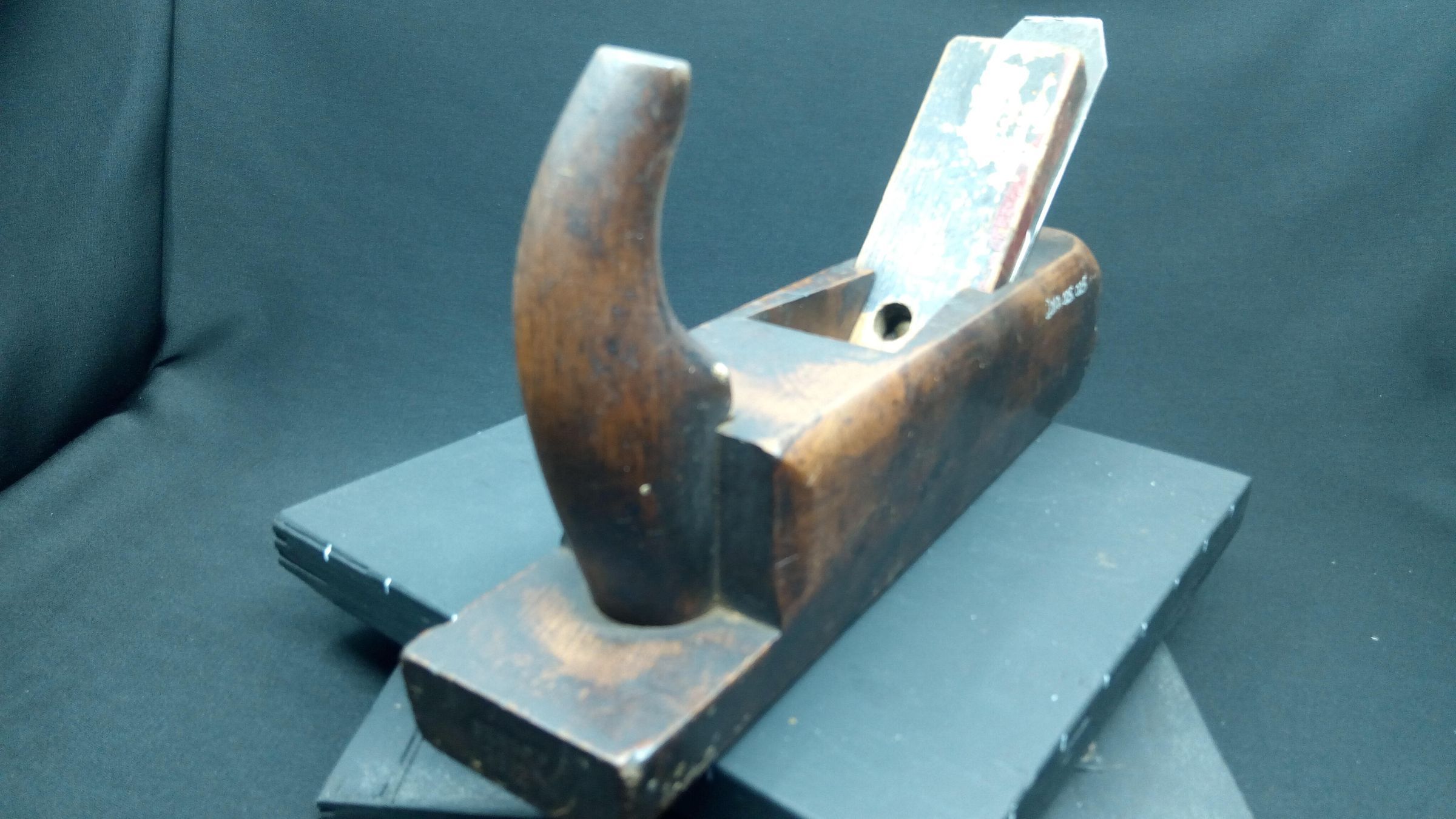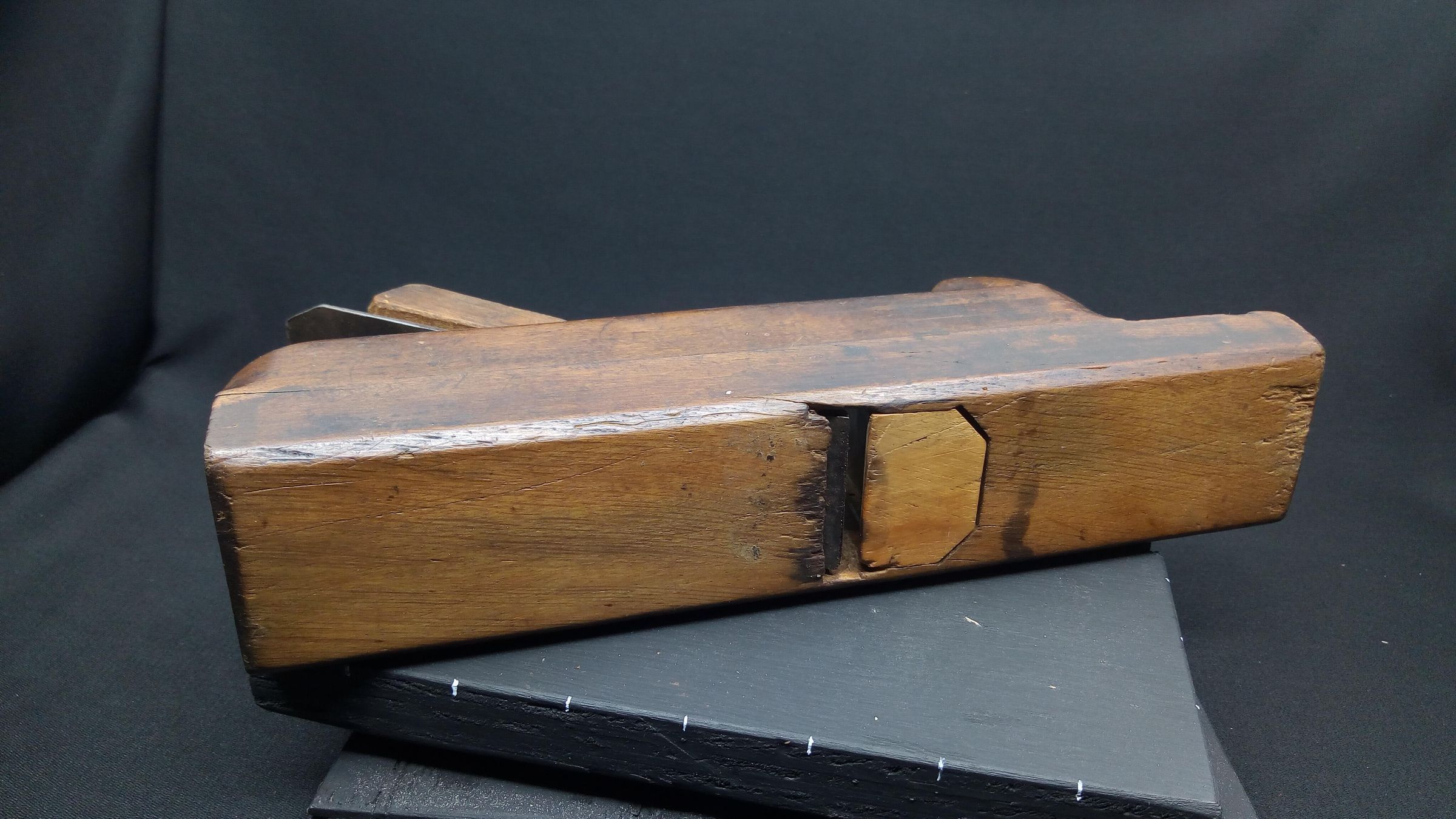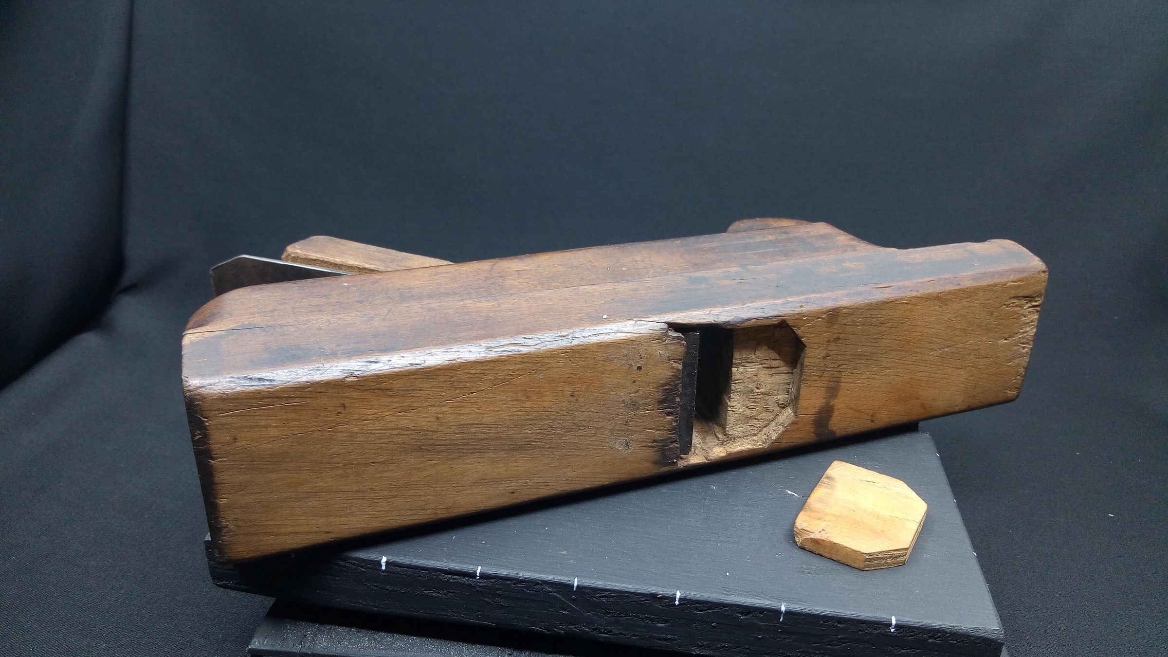 Originally, I believe that this was a scrub plane. That is that it had a blade sharpened to a convex shape to take a thick centred shaving, commonly at a diagonal to the grain, to remove the high points of a board quickly. I think that the boxwood insert for the mouth was an attempt to convert it to a close-mouthed smoothing plane. That would have the blade sharpened close to straight to take thin shavings in final finishing of the board.Context