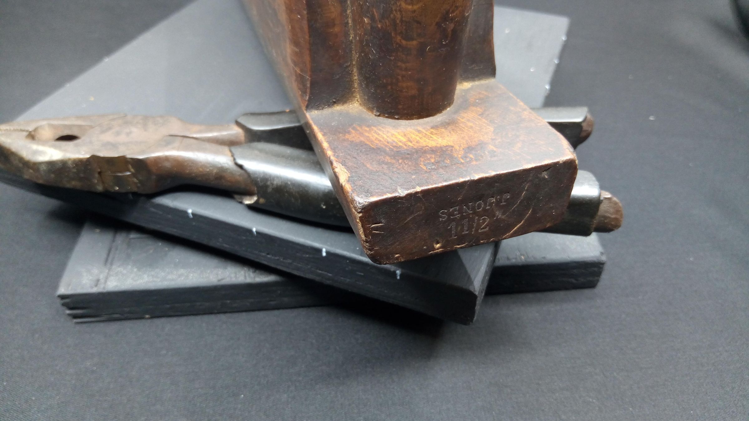 You can see in the photos where the mouth insert is removed that the original mouth of this plane was very wide. That is that the plane blade would have a significant gap between it and the front sole of the plane. A thick shaving would therefore pass the gap, but the surface of the board would be subject to tear-out because the gap would allow it to split ahead of the blade if the grain was going downward at that point. The wear pattern on the front bottom of the plane and behind the mouth suggests that it was used on rough boards. It is likely that the front of the mouth was similarly worn when the decision was taken to re-mouth it. The plane is labelled 1 1/2 inch on the lower front face which would be abnormal for a plane actually made in Europe, so it is likely to have been made in North America for a market niche of European emigrants. There are no maker's marks visible. Only an owner's stamp "J. Jones"