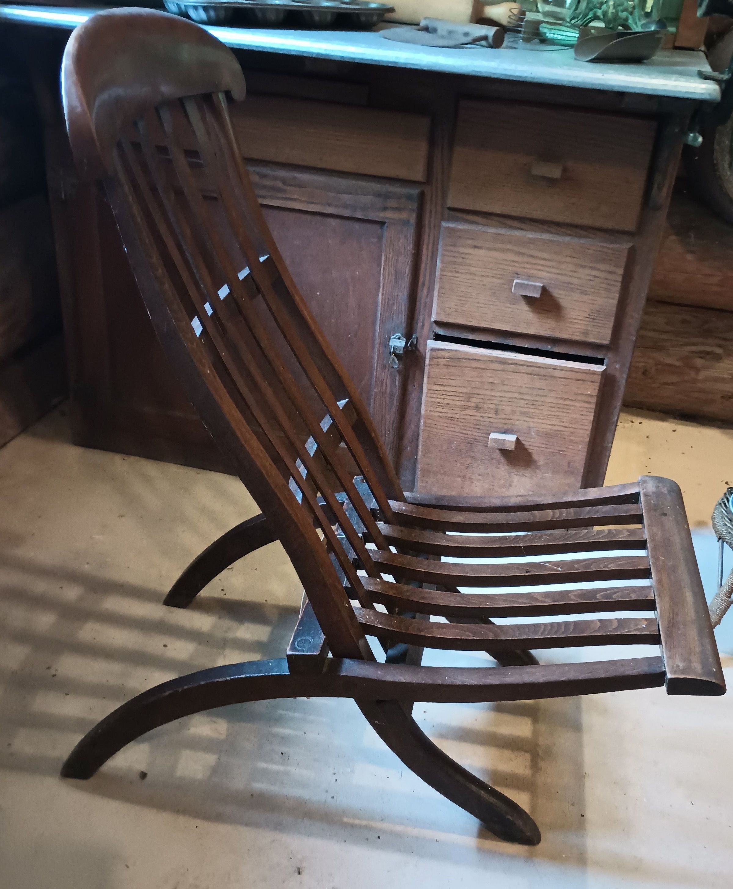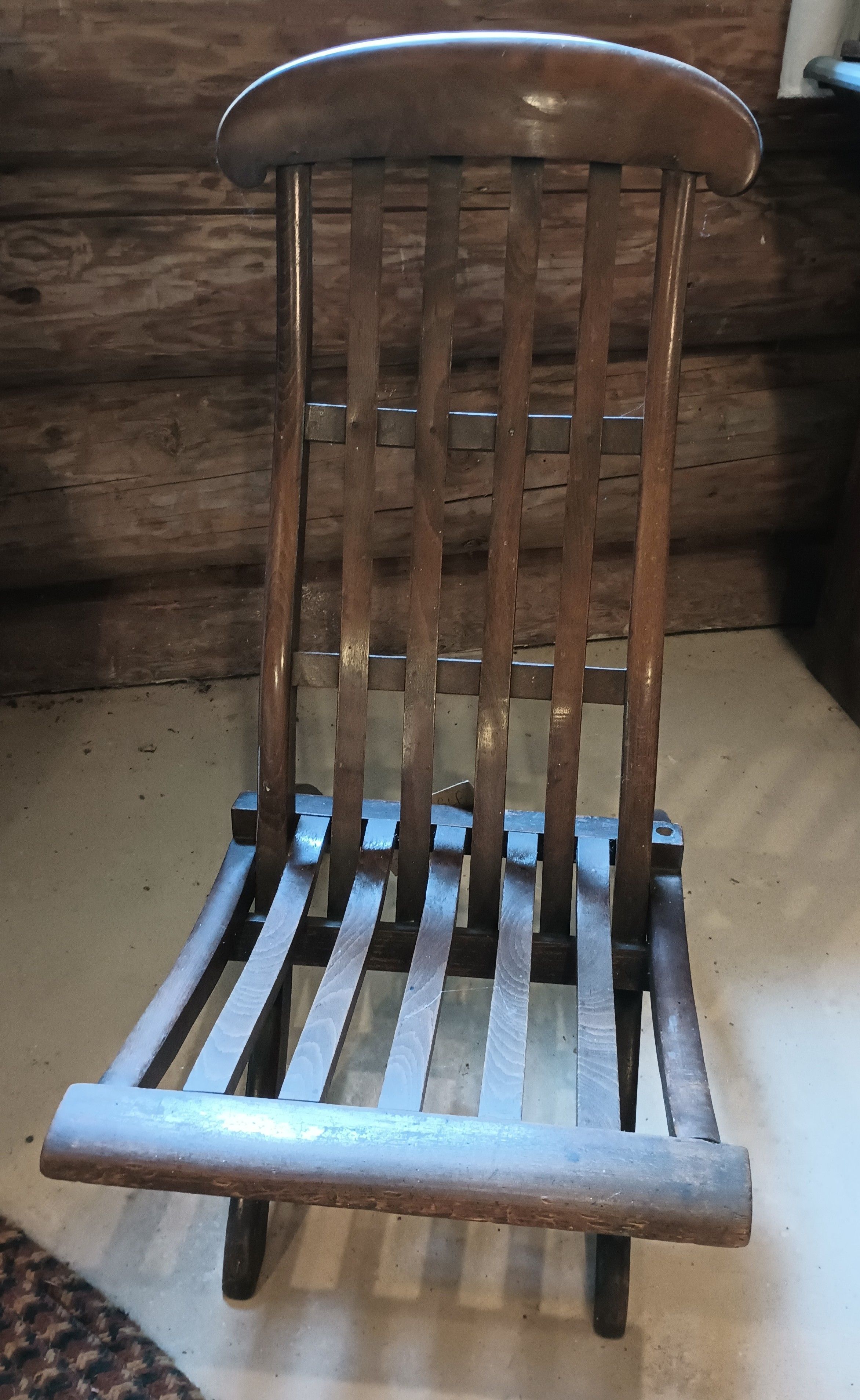 Dark stained wooden folding chair circa 1887, also referred to as a nursing chair.Context