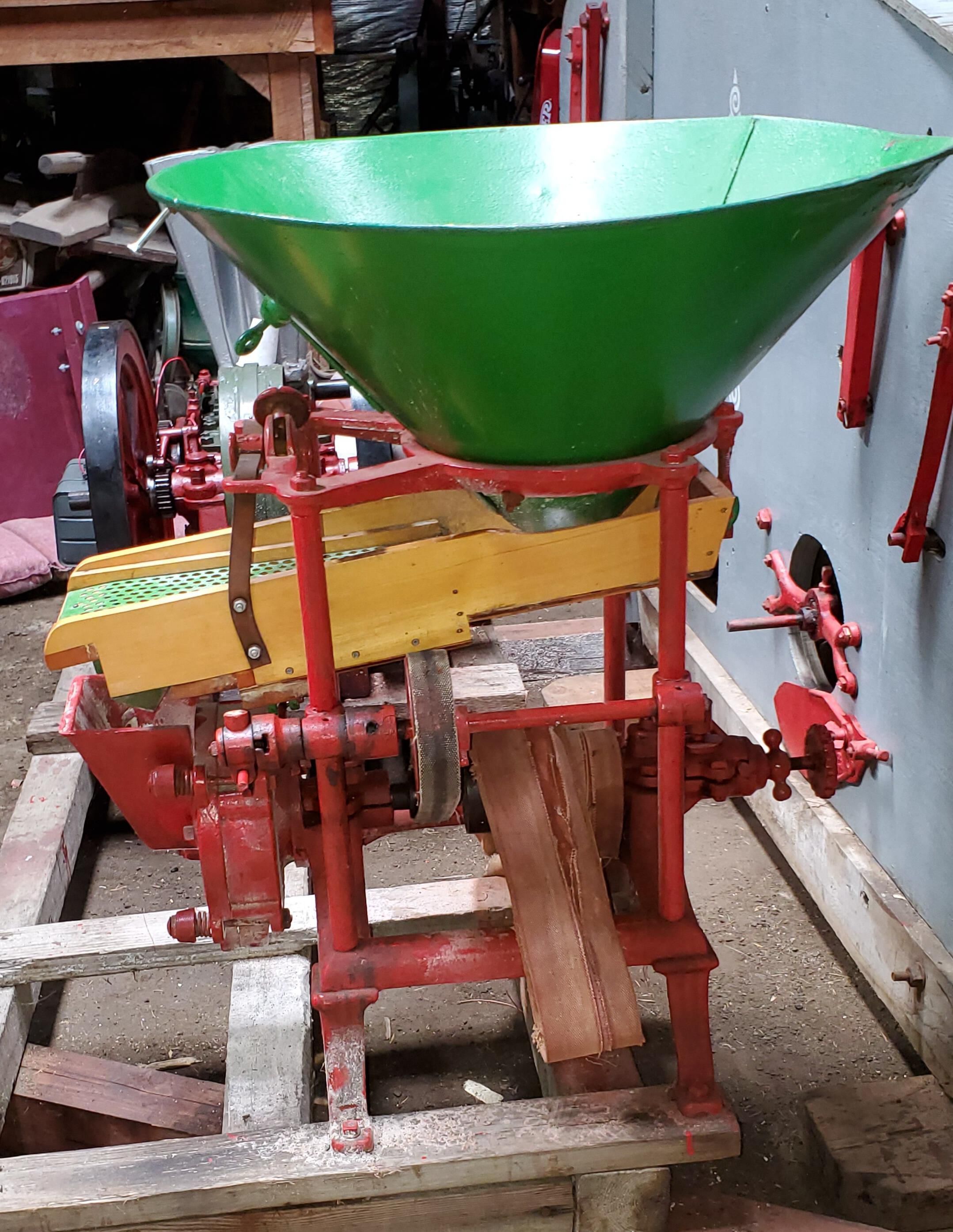 This grain grinder had 8 inch grinding plates and it had a shaker to remove any rocks, wood or straw from the grain before the grain went into the grinder. It was used to make chop for animal feed. It was powered by belt from a stationary engine.