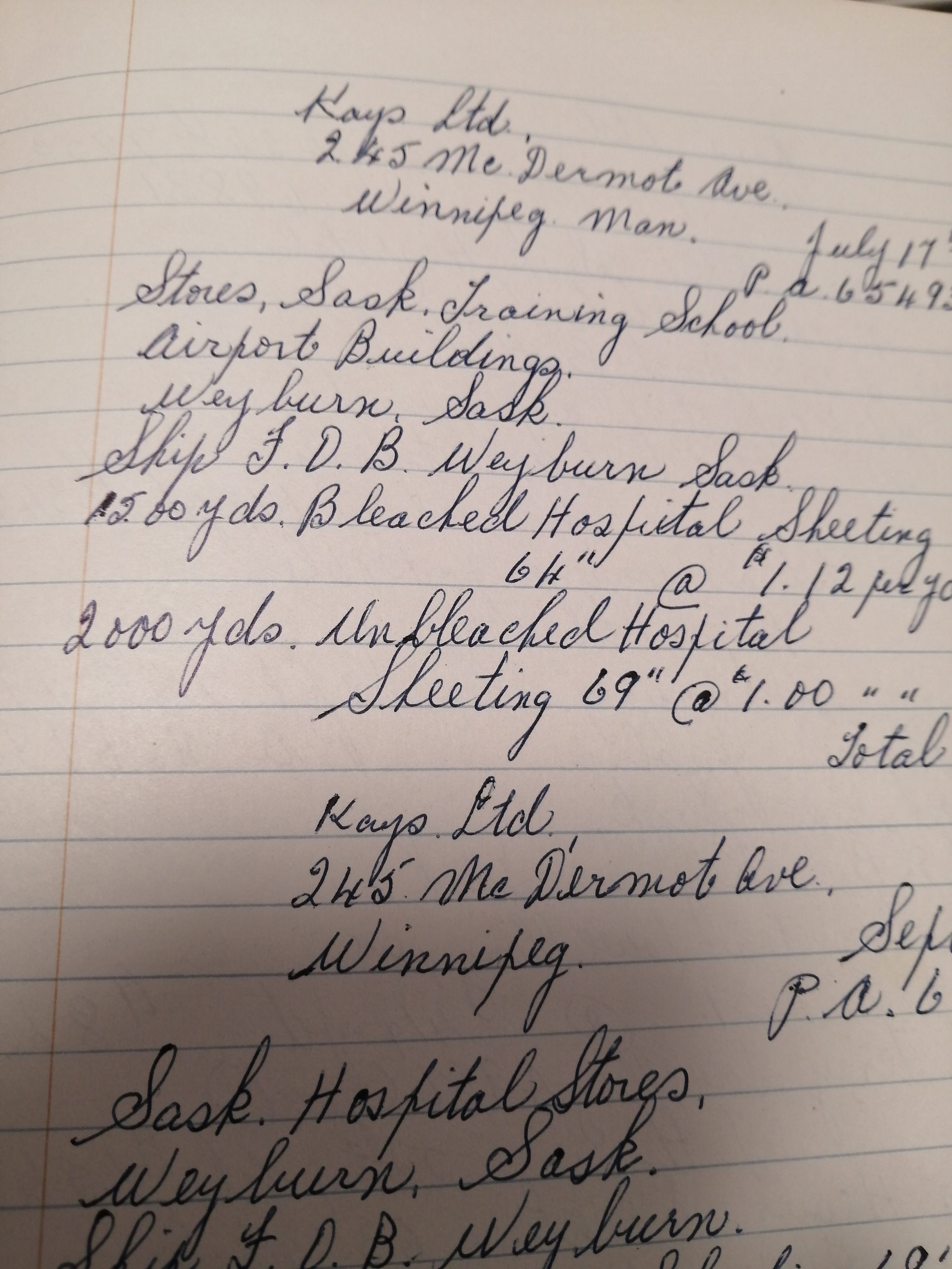 Handwritten. Kays Limited, Winnipeg, Manitoba. Stores, Sask. Training School. Airport building. List of items.
