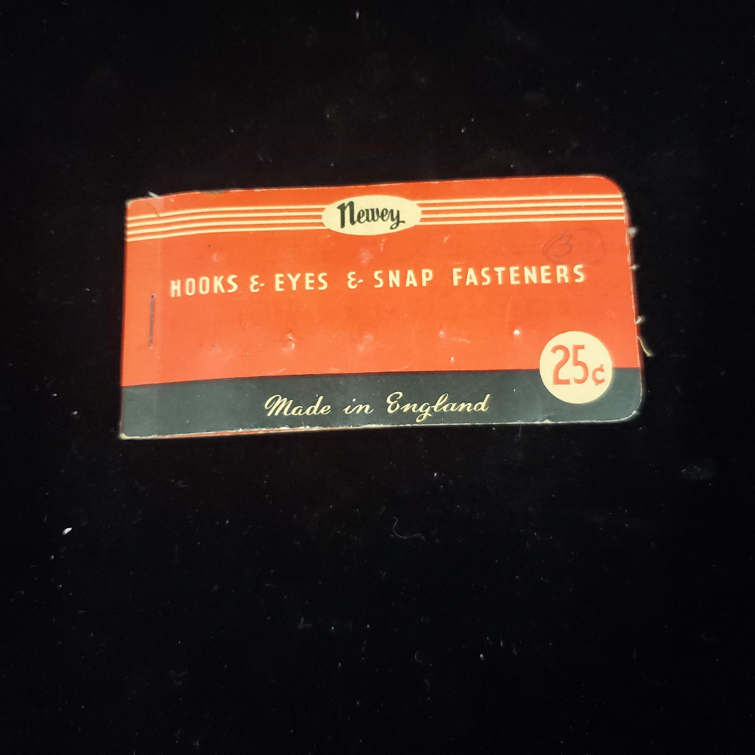Book of snaps. hook & eye fasteners. Small book, mainly red, white and black colours. ÒNewey Hooks E Eyes E Snap Fasteners 25 c Made in EnglandÓ on front cover. 1st page inside -hooks & eyes, 2nd page and back cover snap fasteners.