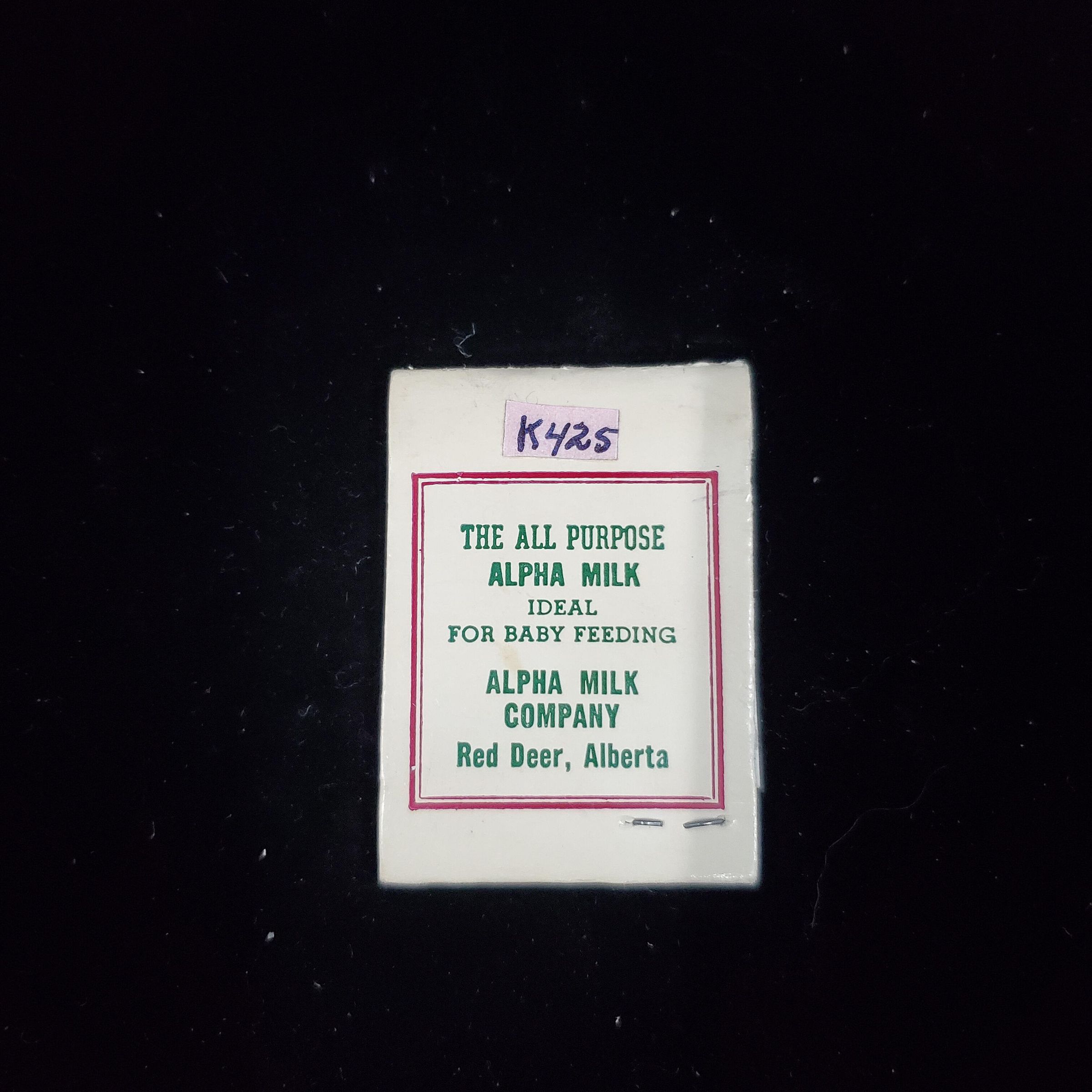 Match folder type Hosiery Mending Kit. Cream colour with brown and green print. Advertising on front cover ÒAlpha It Whips (with logo) Vitamin D Increased Evaporated Milk Homogenized Hosiery Mending Kit Made in U.S.A.Ó More advertising on back.Inside match sticks with glue ends and card of coloured threads with needle.