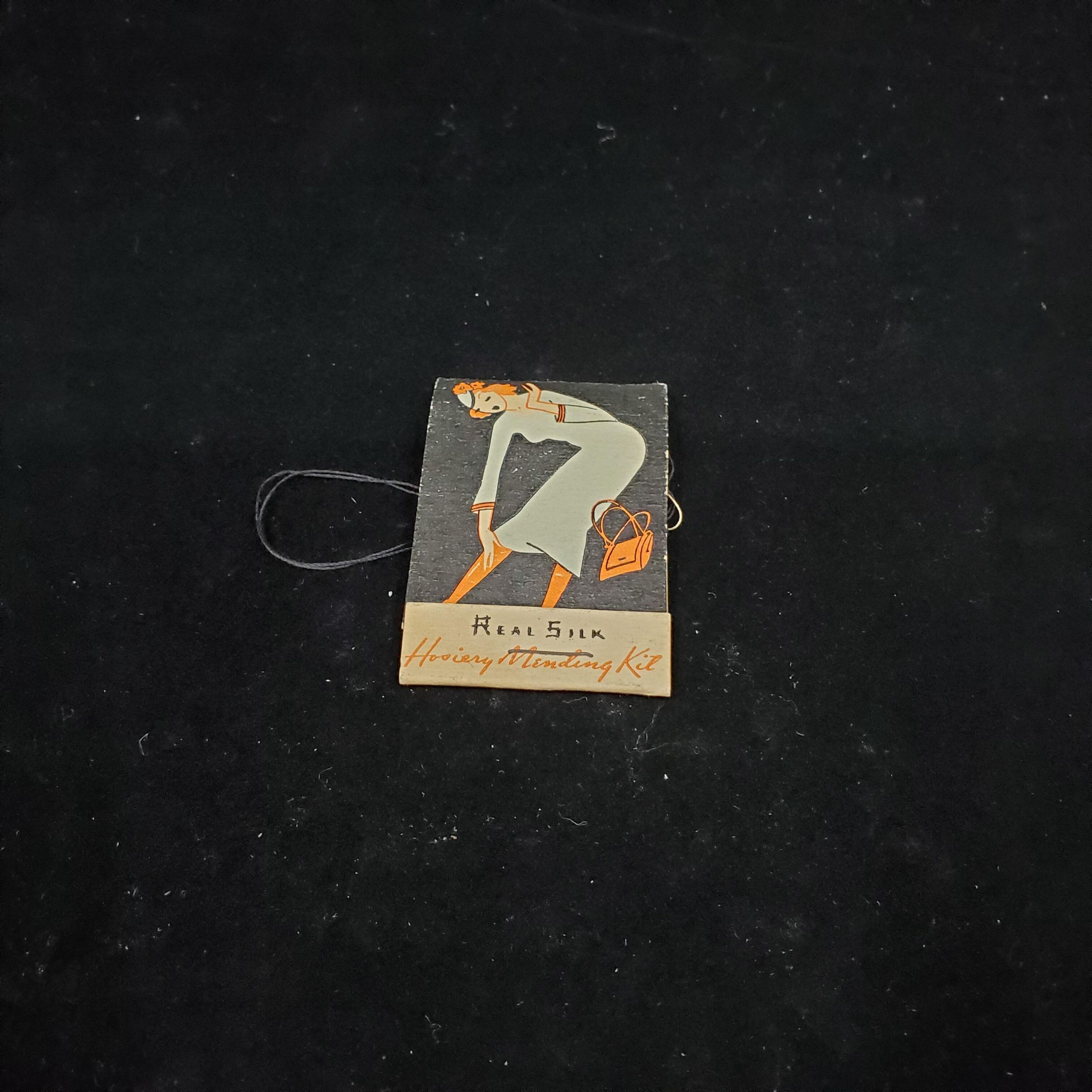Cardboard Advertising match folder type mending kit. Colours black red, green, white. Colourful outside cover of woman bending over to leg stocking. Advertising ÒReal Silk Hosiery Mending KitÓ Back cover more advertising. . Inside card of thread, needle - used., and glue sticks.