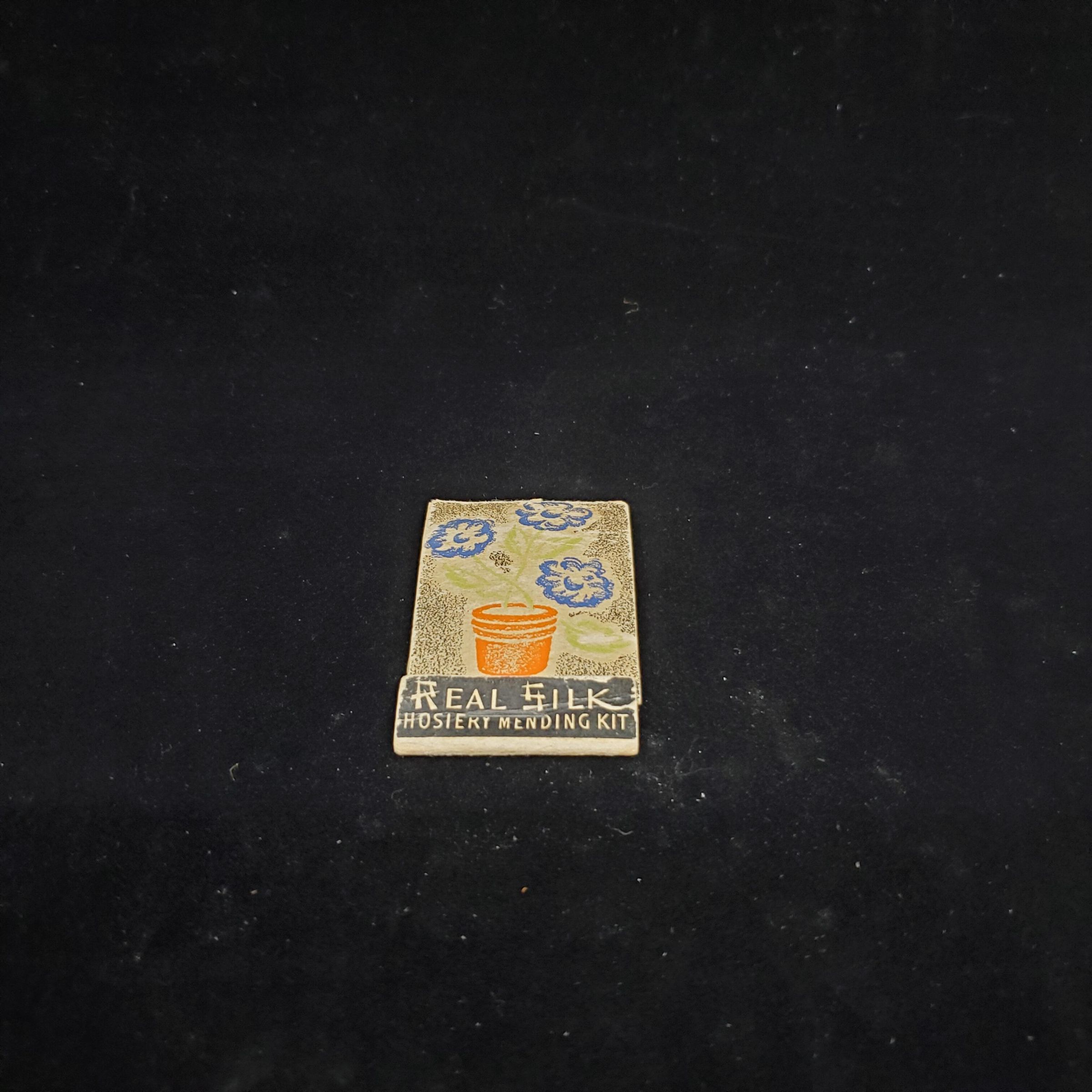 Match folder type mending kit. Advertising. Colours - blue, orange, green. Outiside cover has an orange vase with blue flowers, green leaves and reads ÒReal Silk Hosiery Mending KitÓ More advertising on back. Inside glue sticjks for stopping runs in silk hosiery.
