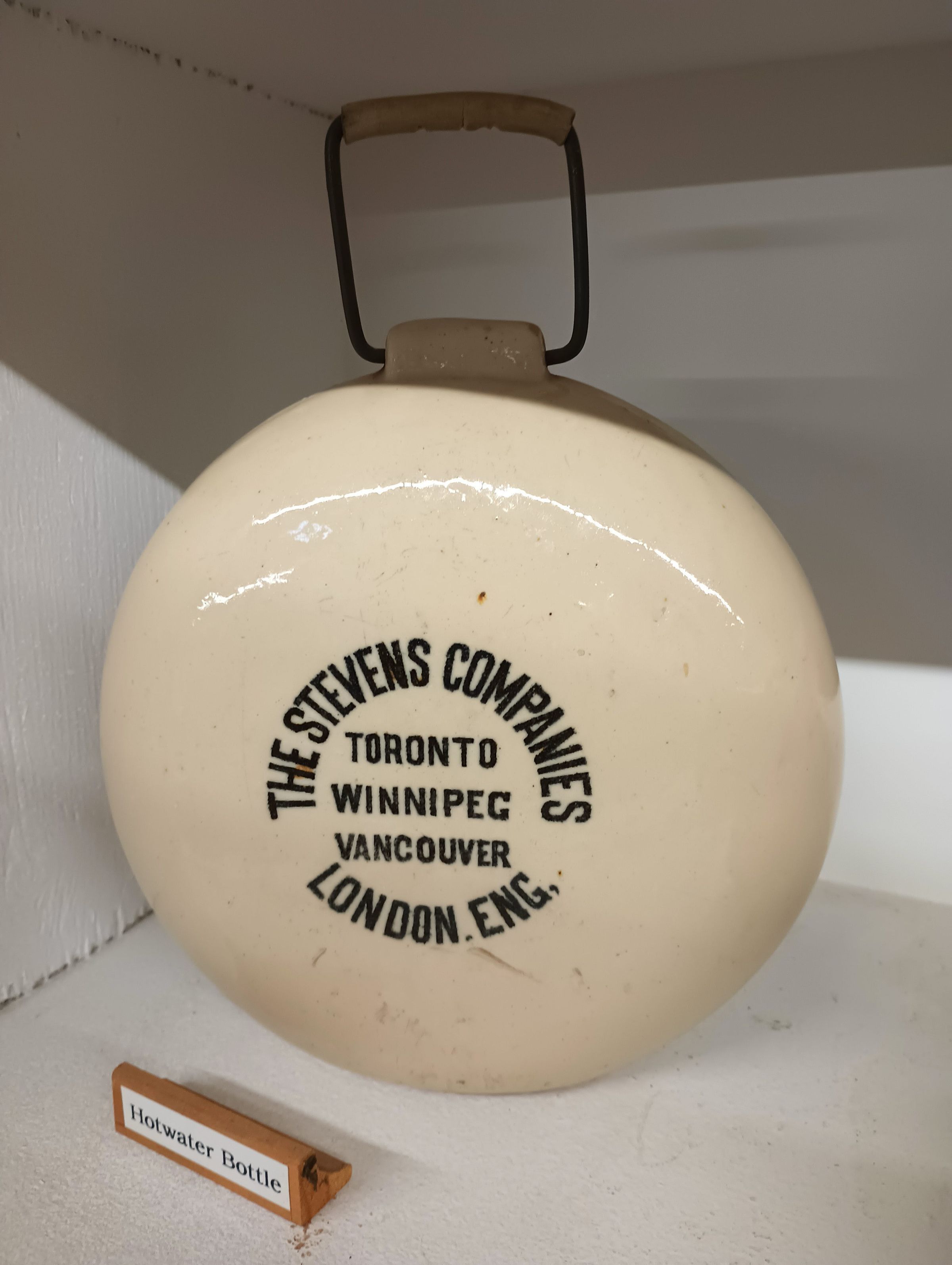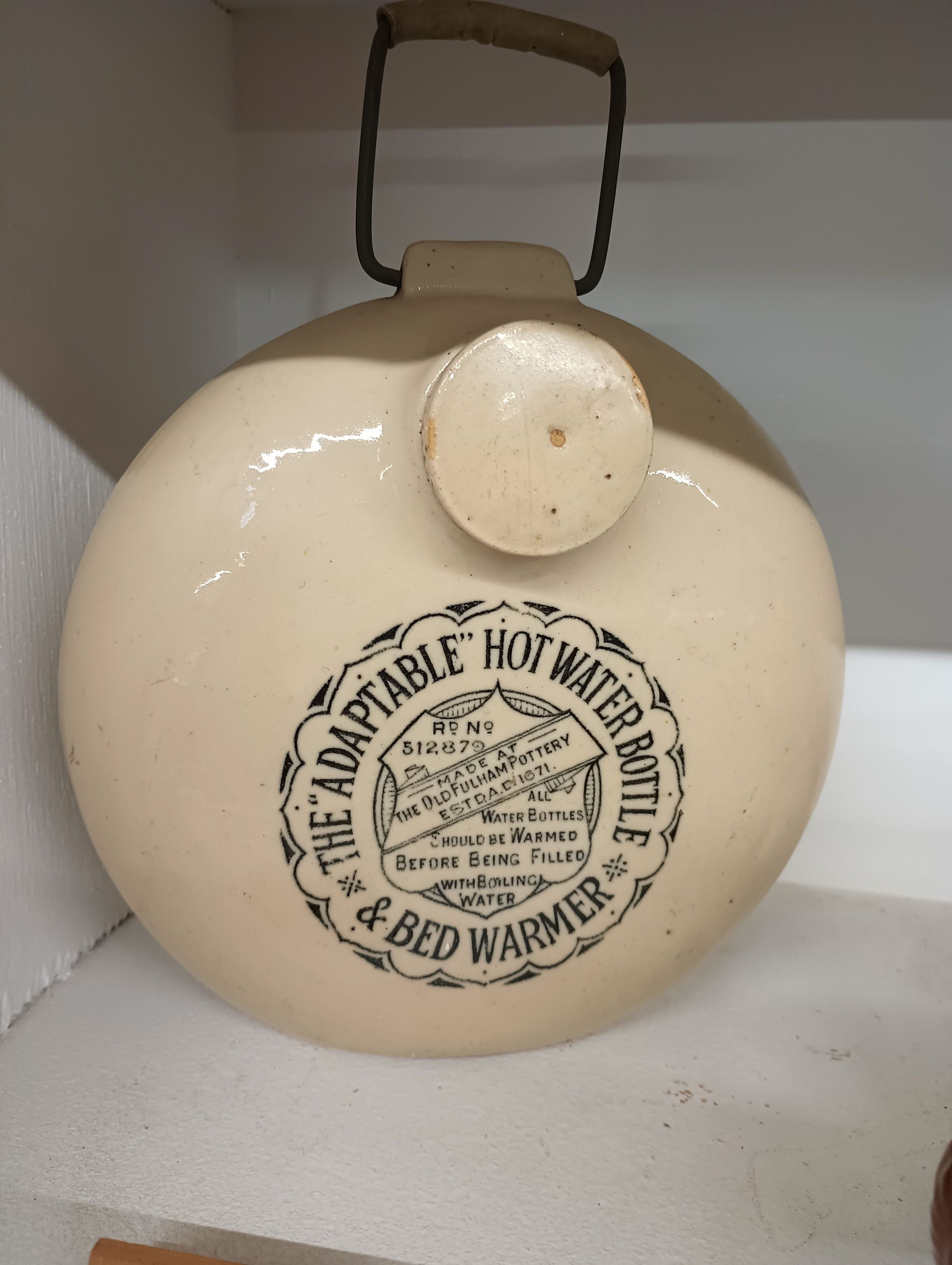 Glazed stoneware bottle with handle. The printing on the front of bottle reads "The adaptable hot water bottle & bed warmer Rd No 512879 made at the Old Fulham Pottery, ESTD.A.D 1671. All water bottles should be warmed before being filled with boiling water".Context
