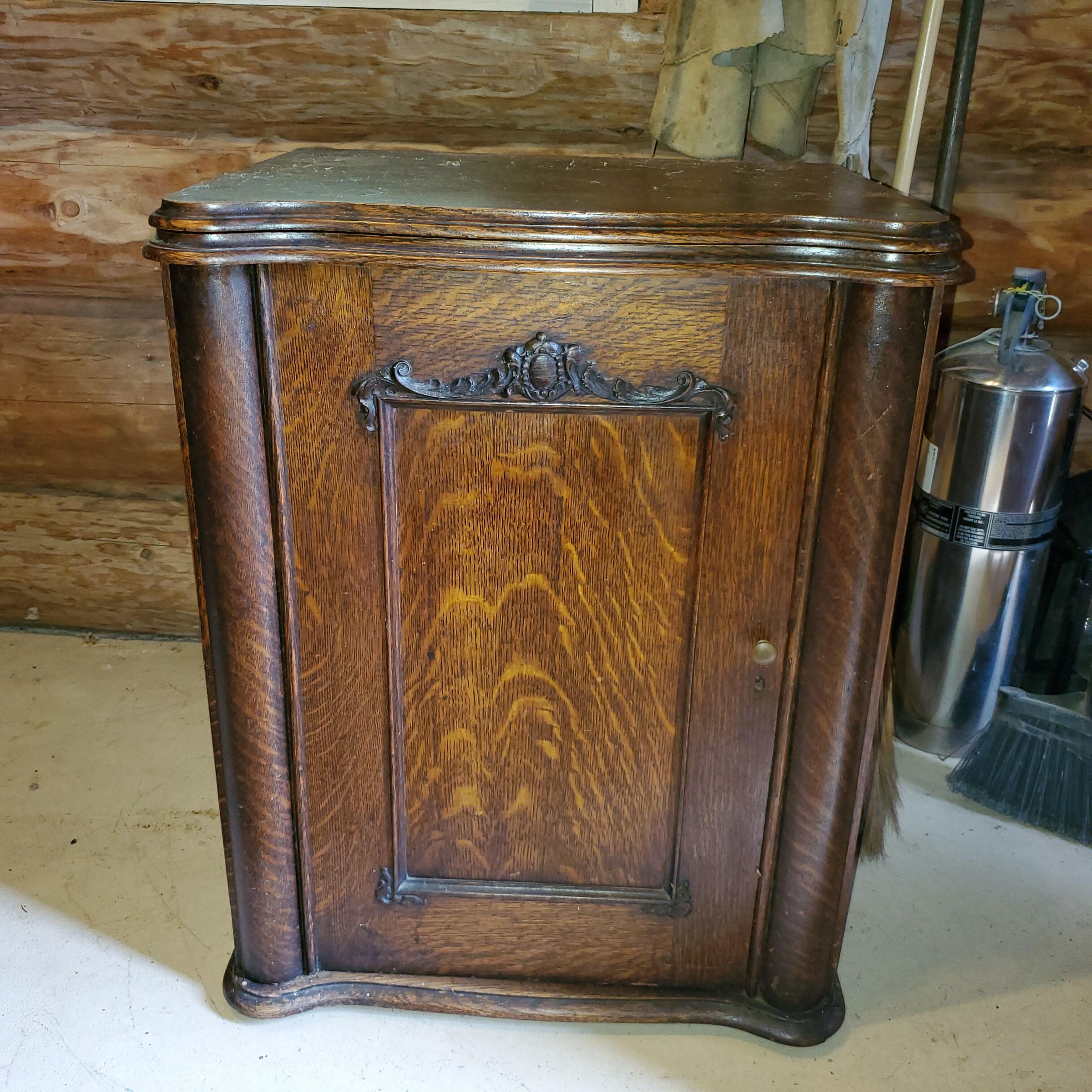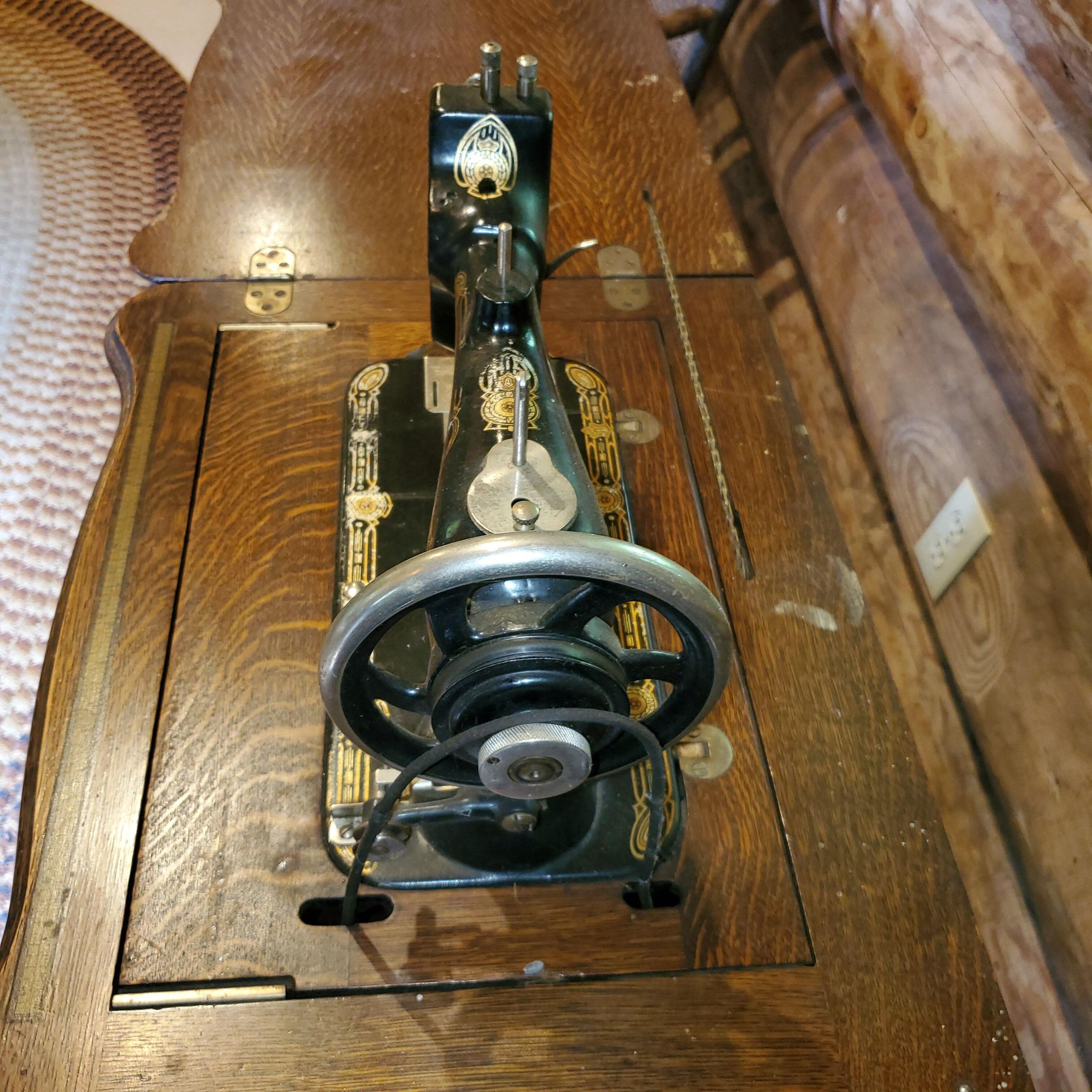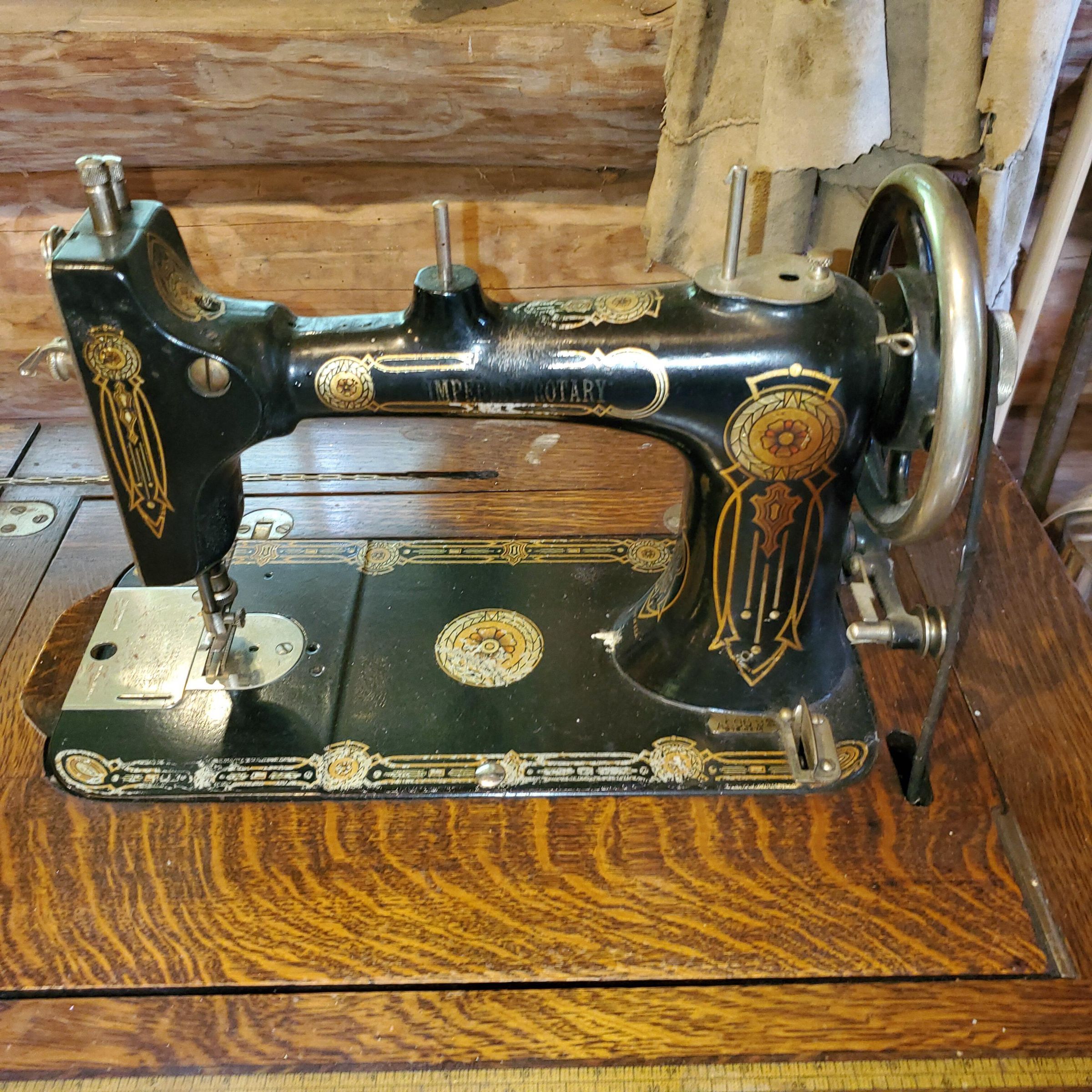 Sewing machine in dark oak cabinet. Imperial treadle, made in U.S.A. two drawers for notions. The treadle is black painted cast iron. Serial #A99692