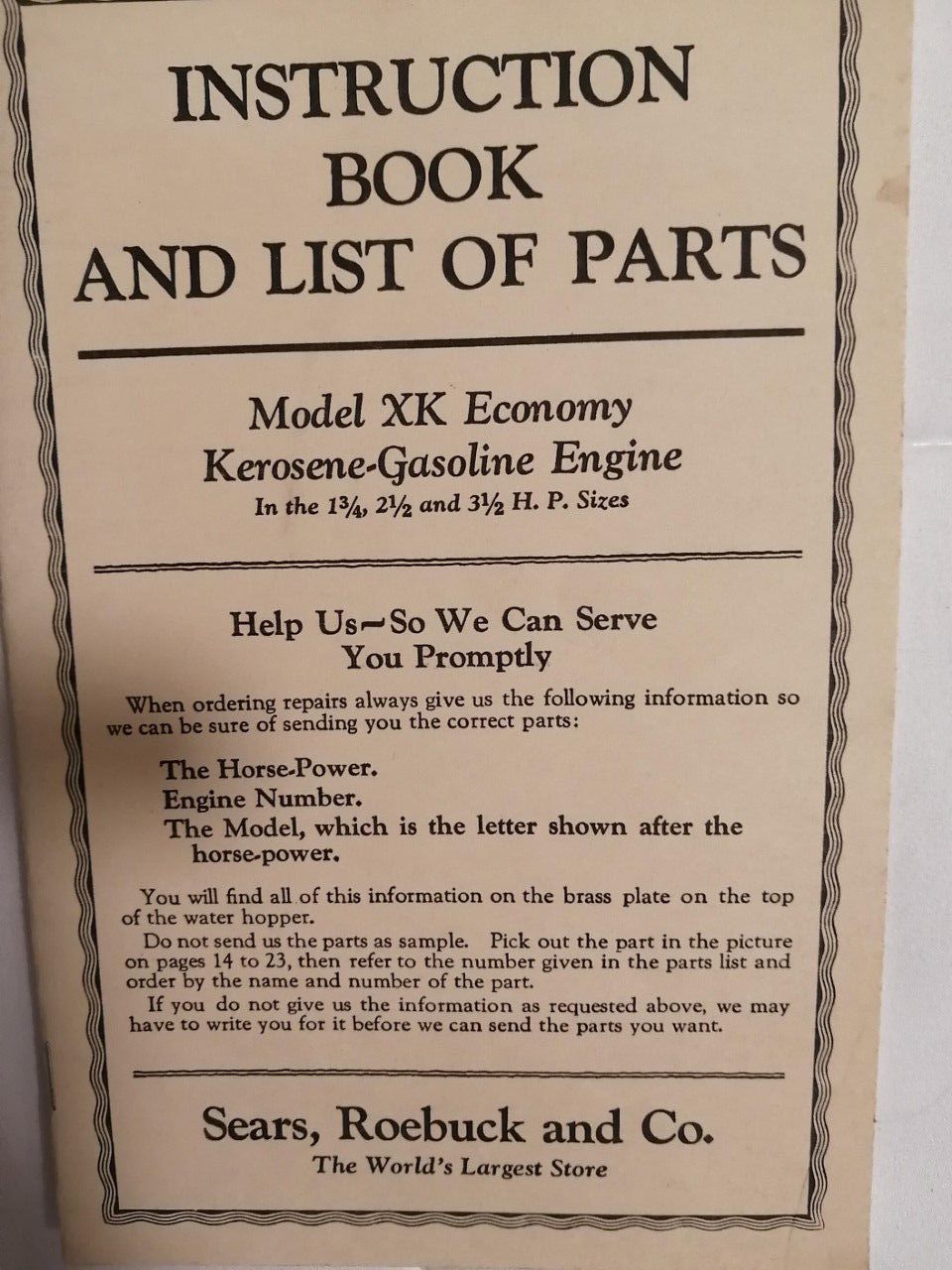 Instruction book and list of parts. Model XK economy kerosene-gasoline engine in the 1 3/4, 2 1/2, and 3 1/2 H. P. series