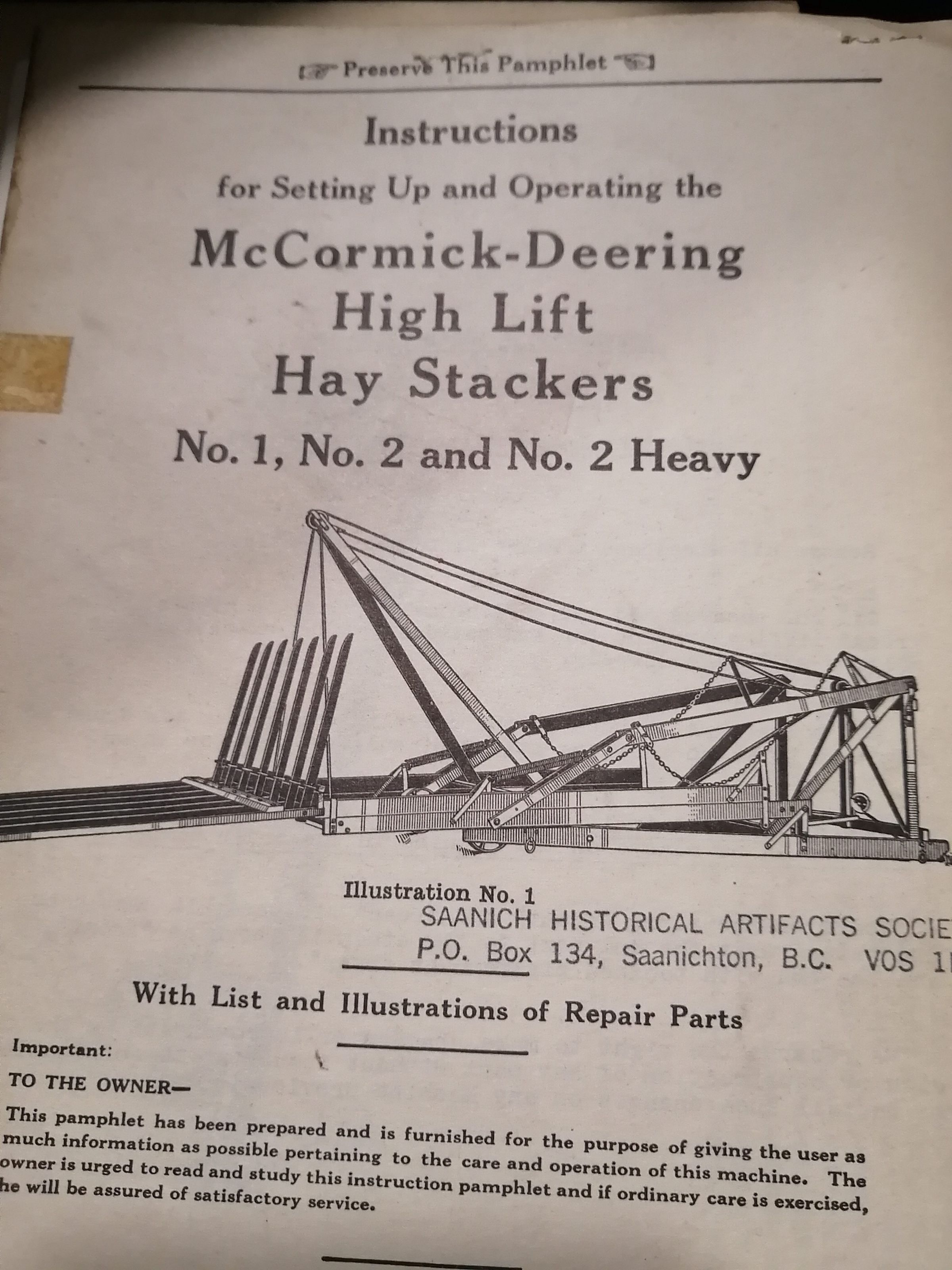 Instructions for setting up the Mccormick-Deering high lift hay stacker. No. 1, No. 2, and No. 2 heavy