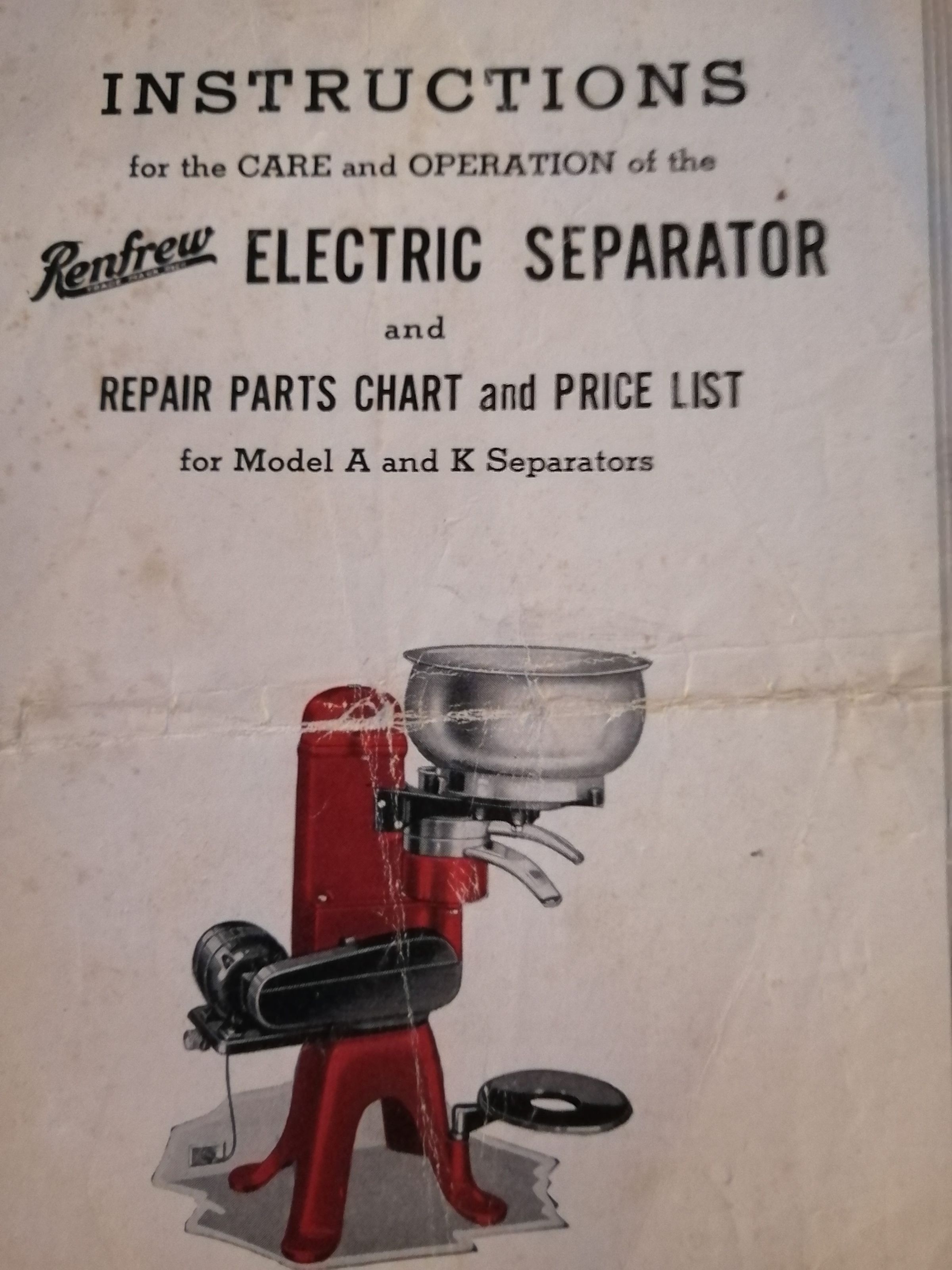 Instructions for the care and operation of the Renfrew electric separator