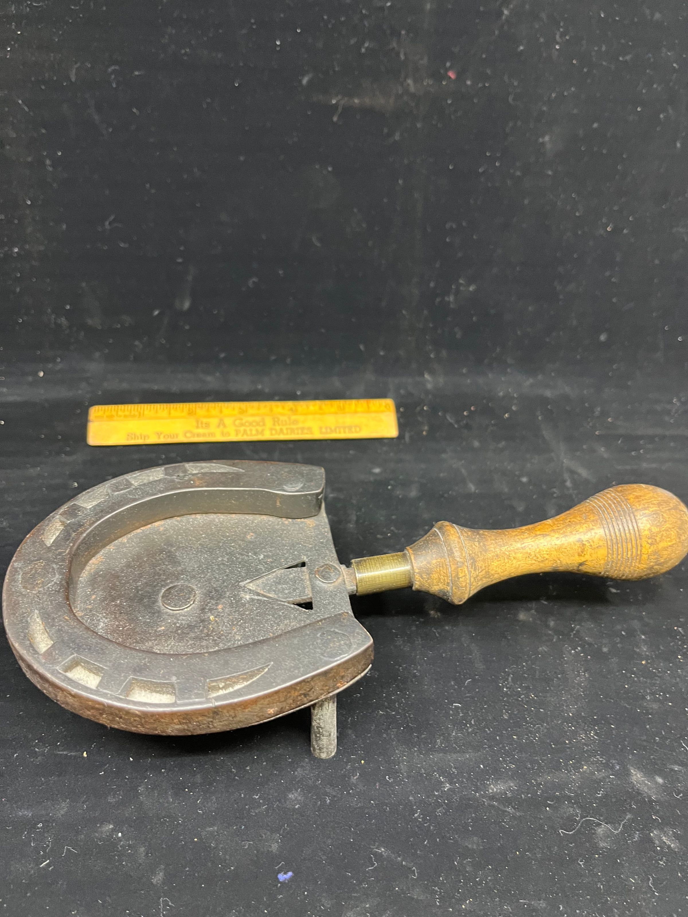 Small horseshoe shaped iron trivet with metal handle