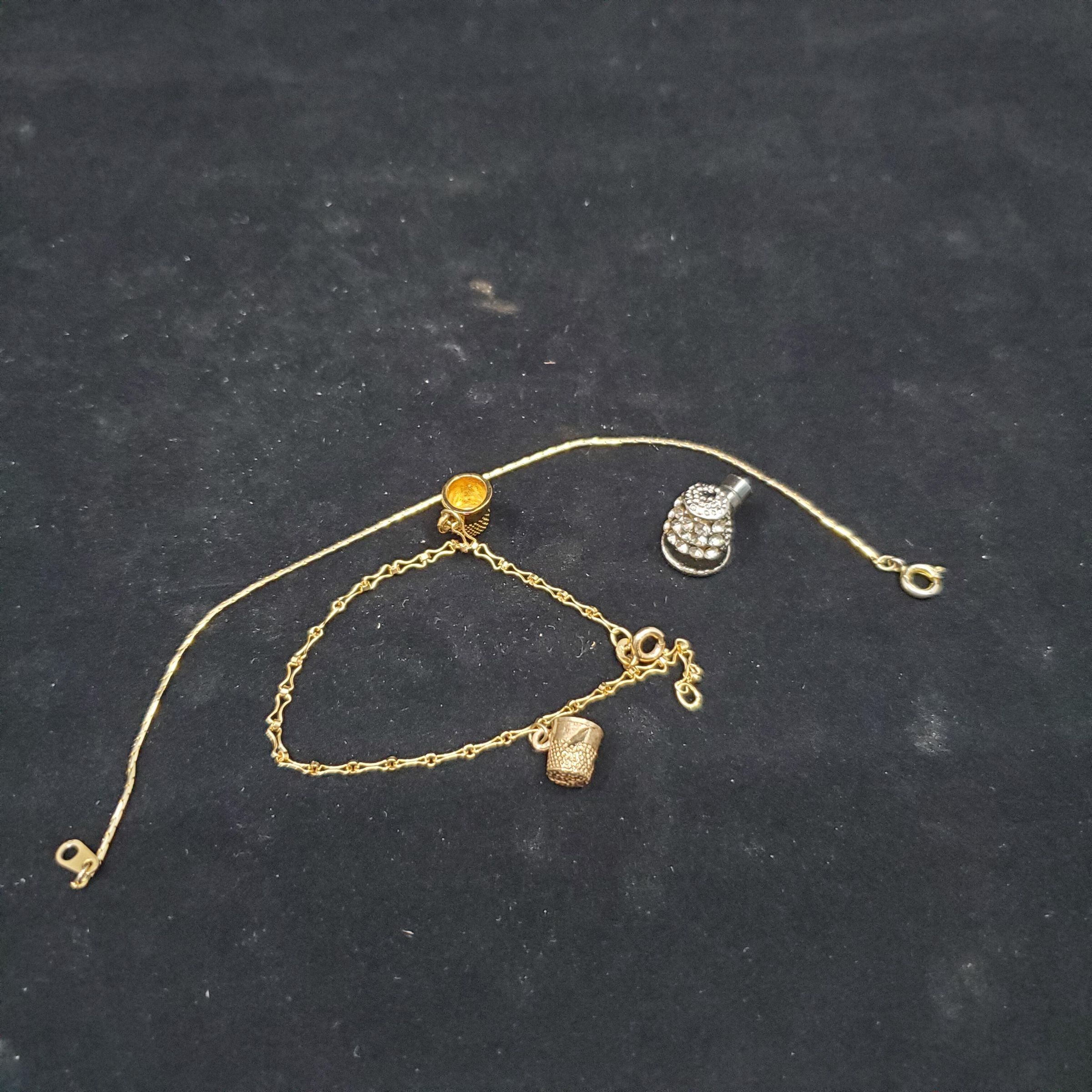 Box of thimble jewellery. Fine chain gold bracelet with 2 gold thimble charms. One thimble stamped inside Ster - DM. Second thimble has slash marks across band and is stamped 10K. Thimble pin has brilliants