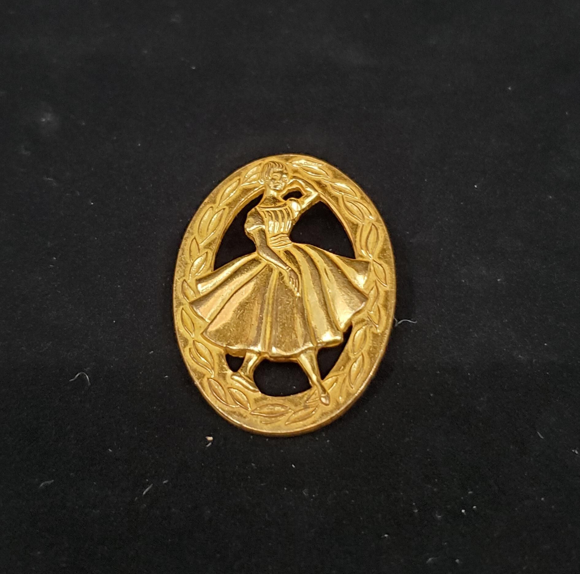 Gold metal oval shaped pin. Outside band has lauerl? leaves around.Inside a young girl with flared skirt dress. On back it reads ÒSinger Teenage Dressmaking Contest Qualifiers Award,Ó