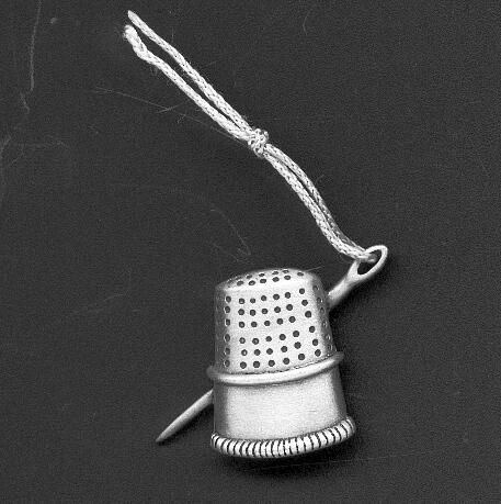 Pewter brooch consisting of a needle with thread and a thimble. Stamped on back but can not read - probably same as K 1554
