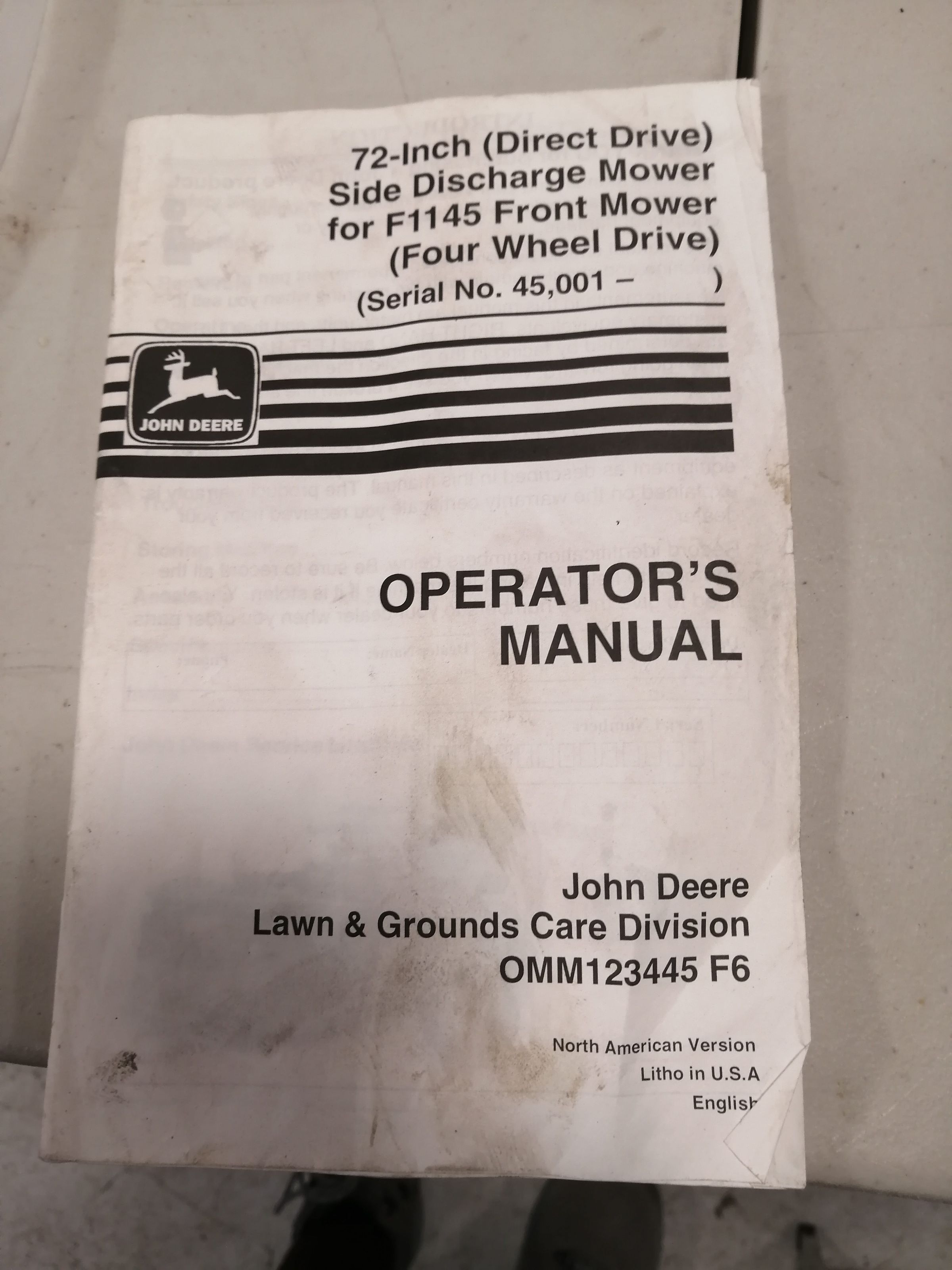 John Deere. Operator's manual. 72-inch (direct drive) side discharge mower for F1145 front mower (four wheel drive) (Serial No. 45,001-)