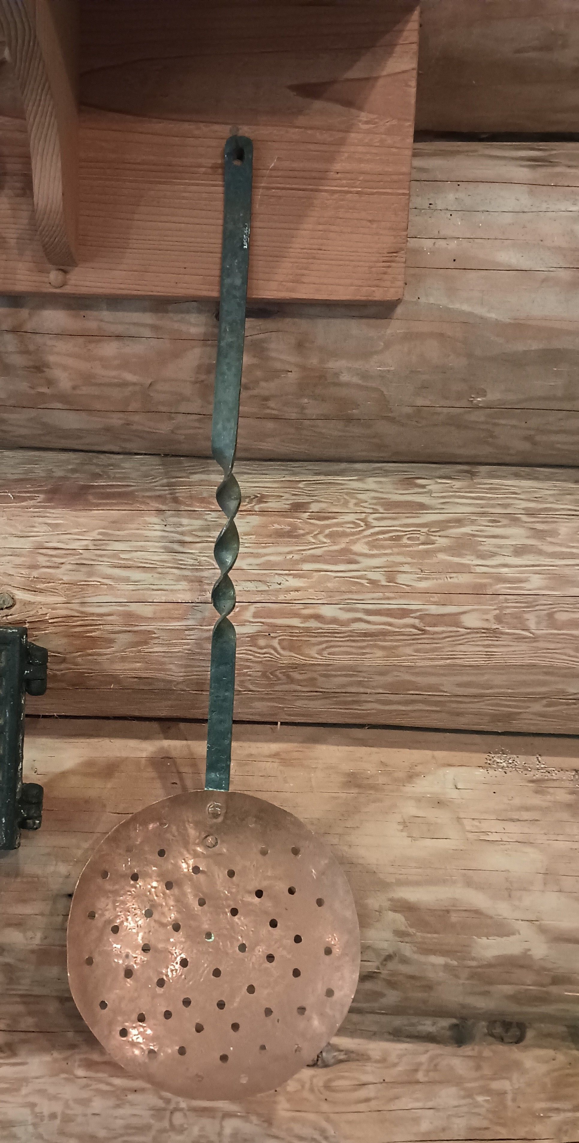 Long handled flat copper spoon with perforations.