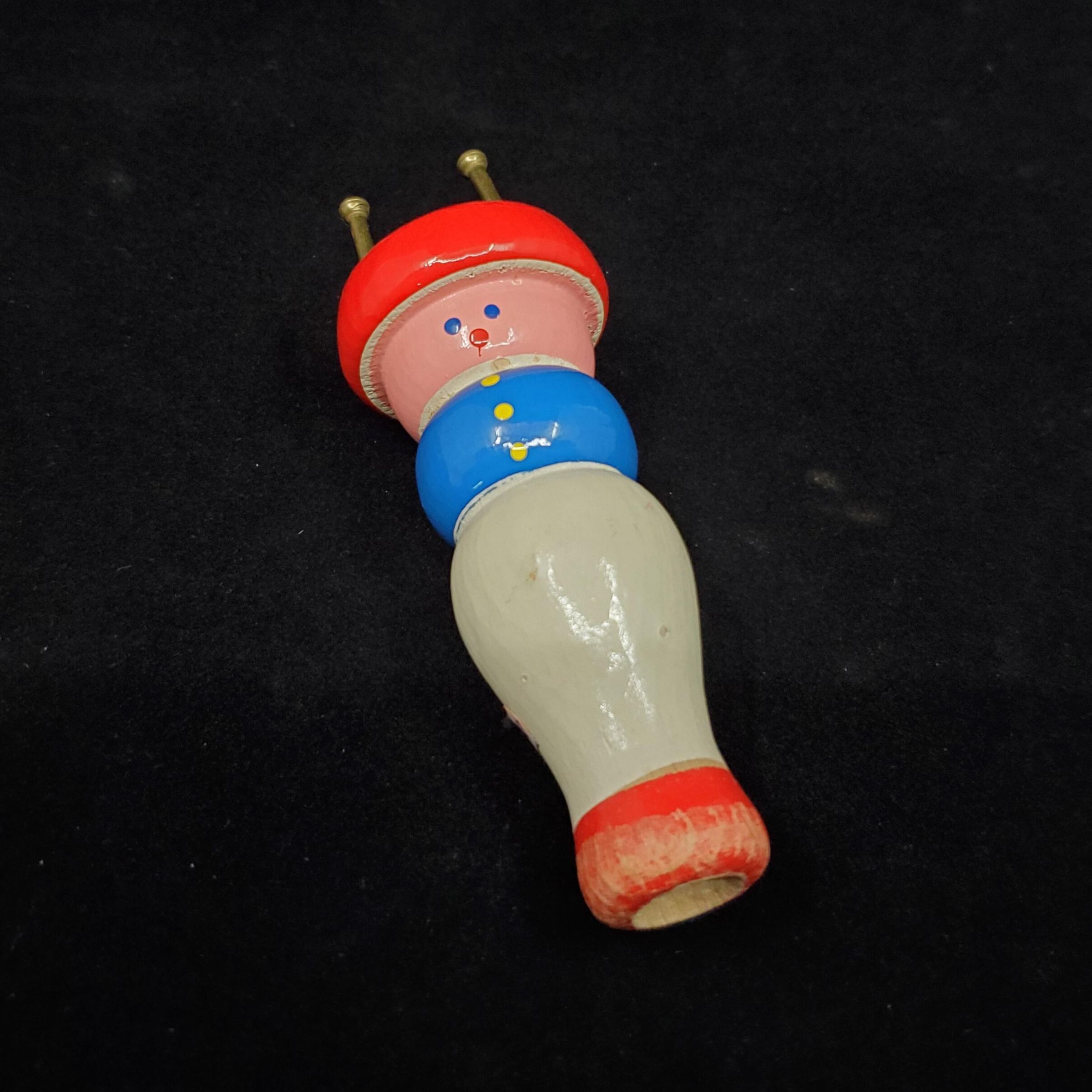 Knitting ÒnancyÓ. modern version. Wooden, painted. In shape of childÕs face and body. Colours - red, pink, blue and white. Red hat, pink face with blue eyes, red mouth, blue vest with white buttons, white pants and red at base. 4 nails on top with center hole.