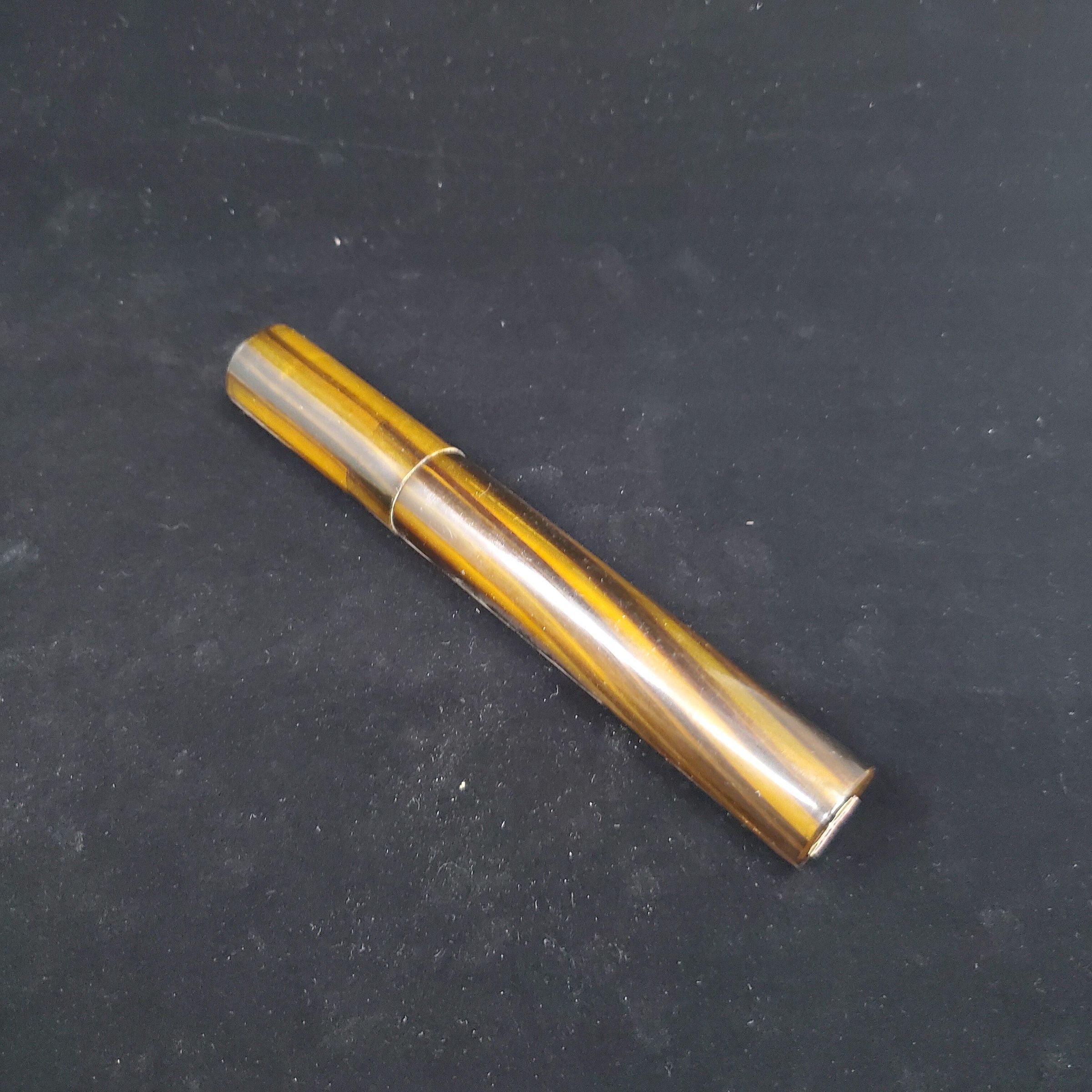 Imitation? tortoise shell case for knitting needles, crochet hooks, etc.Push on top.