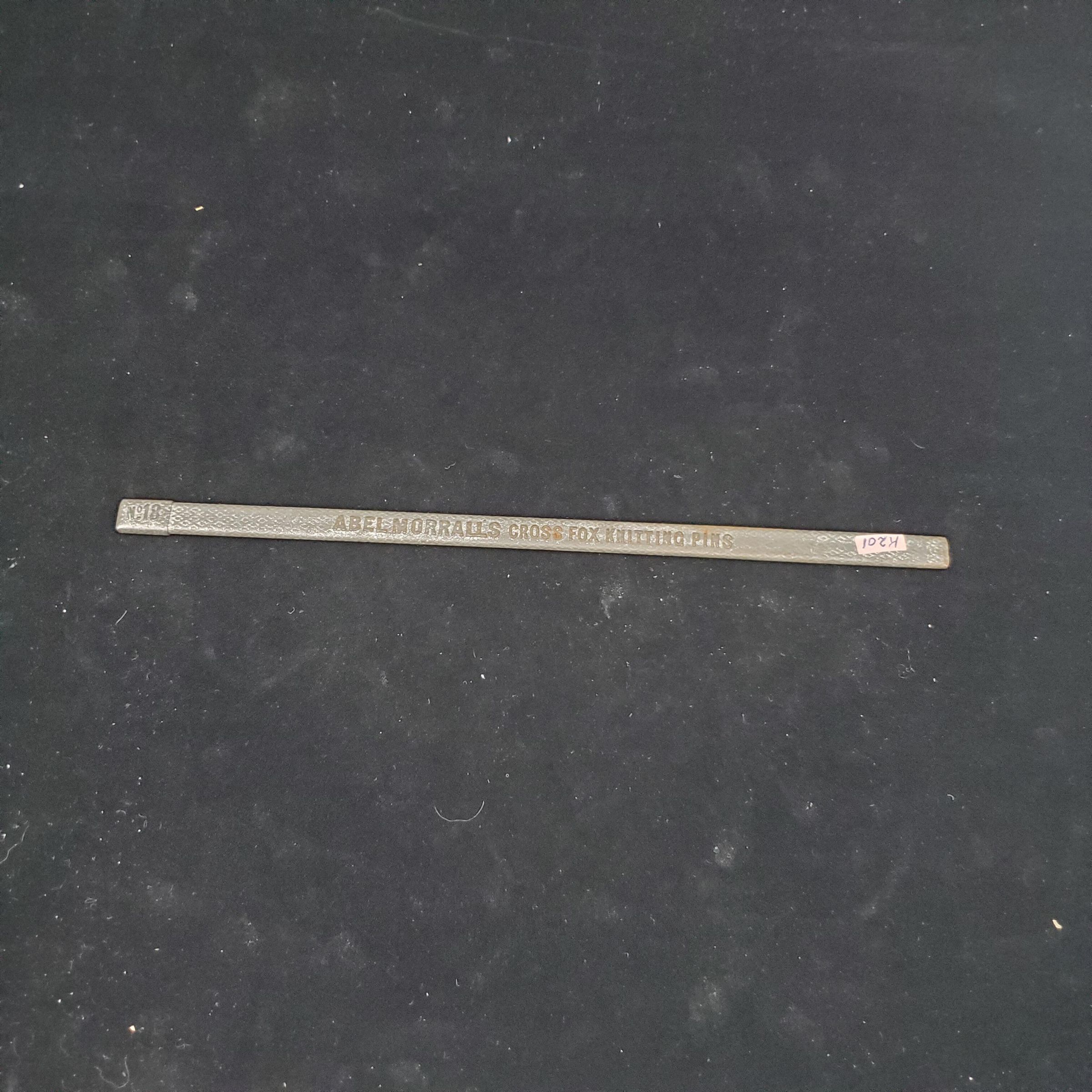 Knitting needle set of 4 short needles with points both ends. in gray steel case. Case stamped ÒAbel MorrallÕs Cross Fox Knitting Pins.Ó No. 18 also stamped on case. Needles also steel.