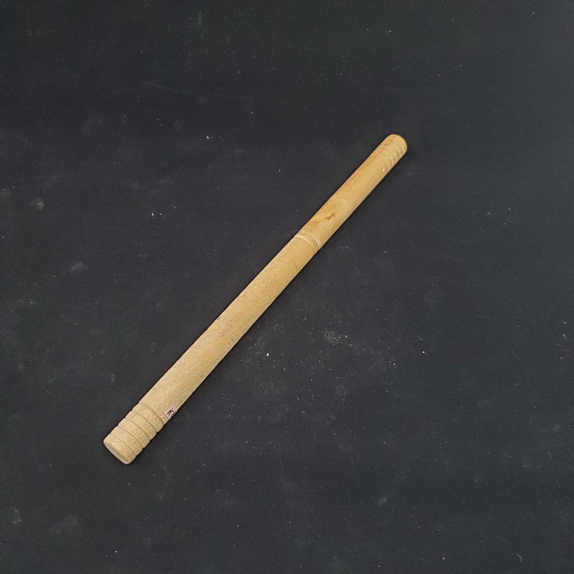 Wooden knitting needle holder with 10 steel double pointed needles inside. Light tan coloured unfinished wooden case with 6 decorative cuts near top and bottom of case. Printed on side Ò17 Abel Morrall Ltd. Made in EnglandÓ