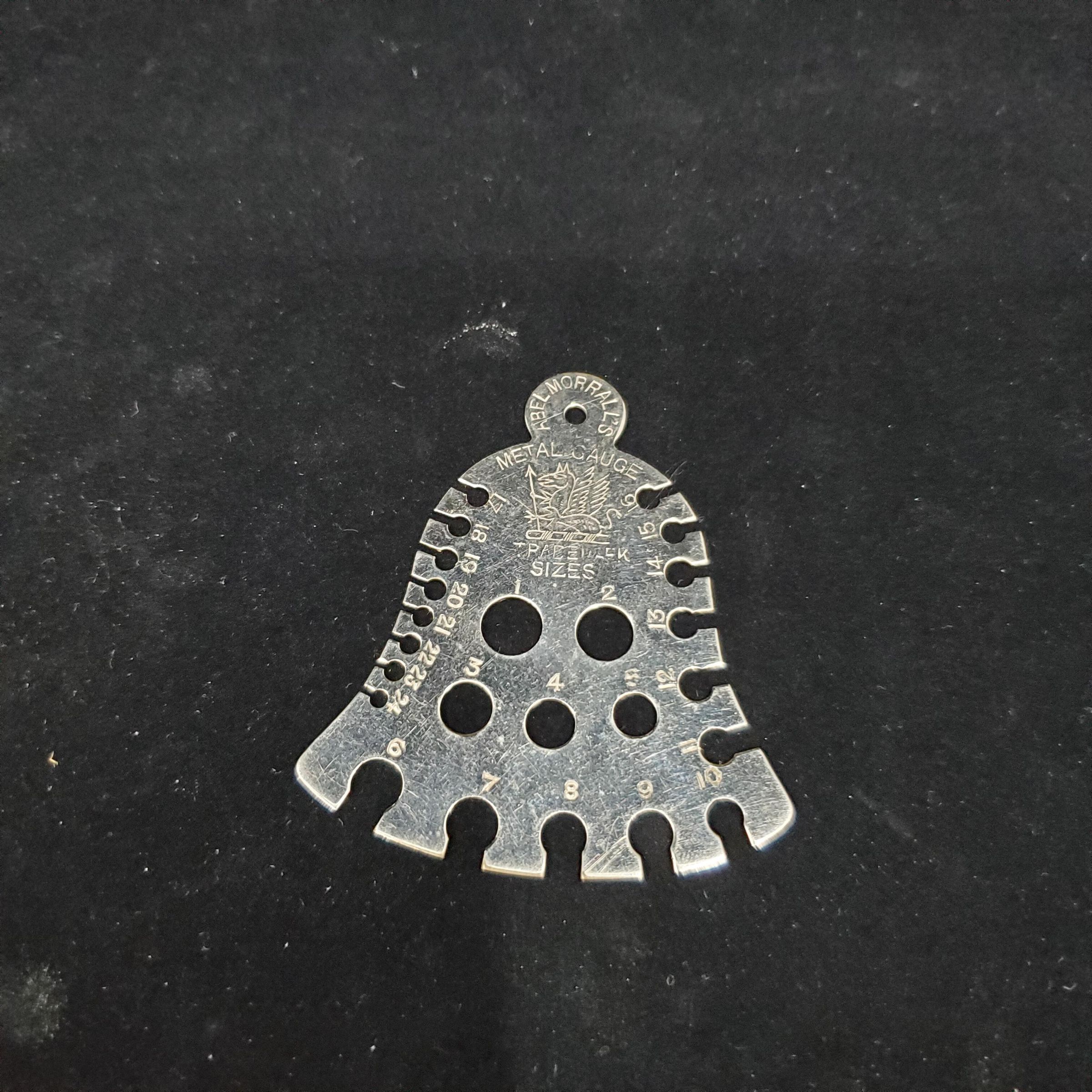 Knitting needle metal - probably nckel - measure in shape of bell. Stamped on measure ÒAbel MorrallÕs Metal Guage Unicorn TrademarkÓ and mark of unicorn. 24 sized holes.