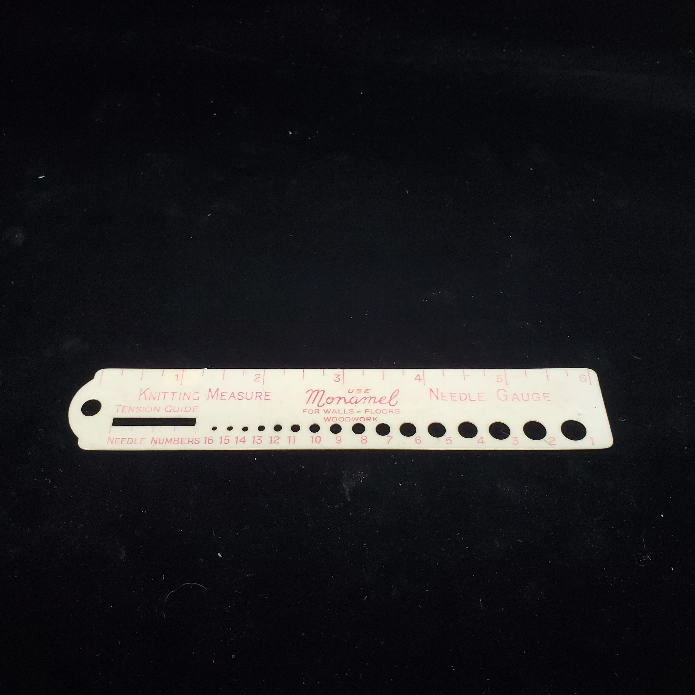 Cream coloured plastic knitting needle gauge. Advertising. Pink lettering advertising ÒMonamelÓ Holes marked in pink numbers and also tension gauge. Advertising on back also. Hole for hanging at one end.
