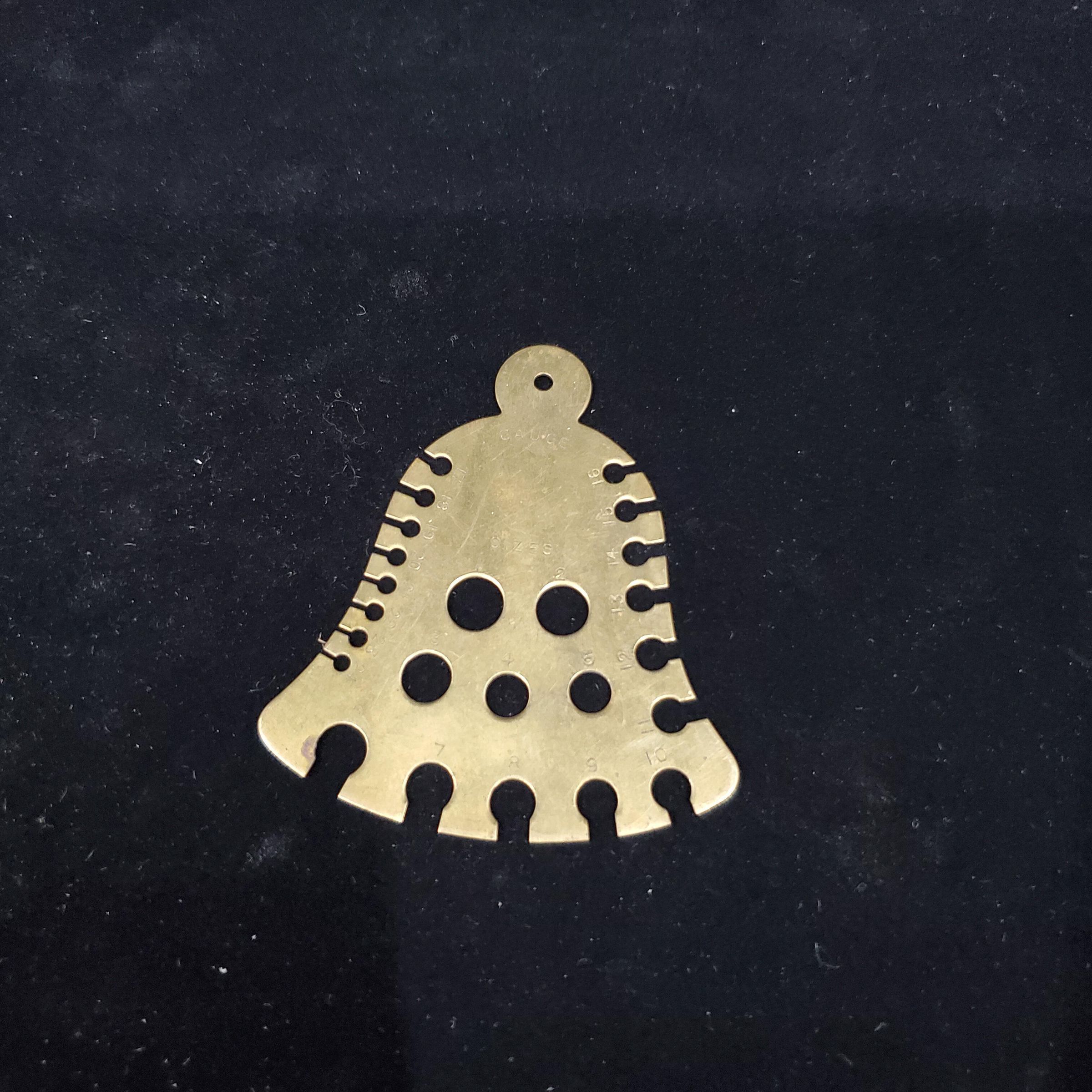 Brass knitting needle gauge in shape of bell. Holes for sizing. Sizes to 24.