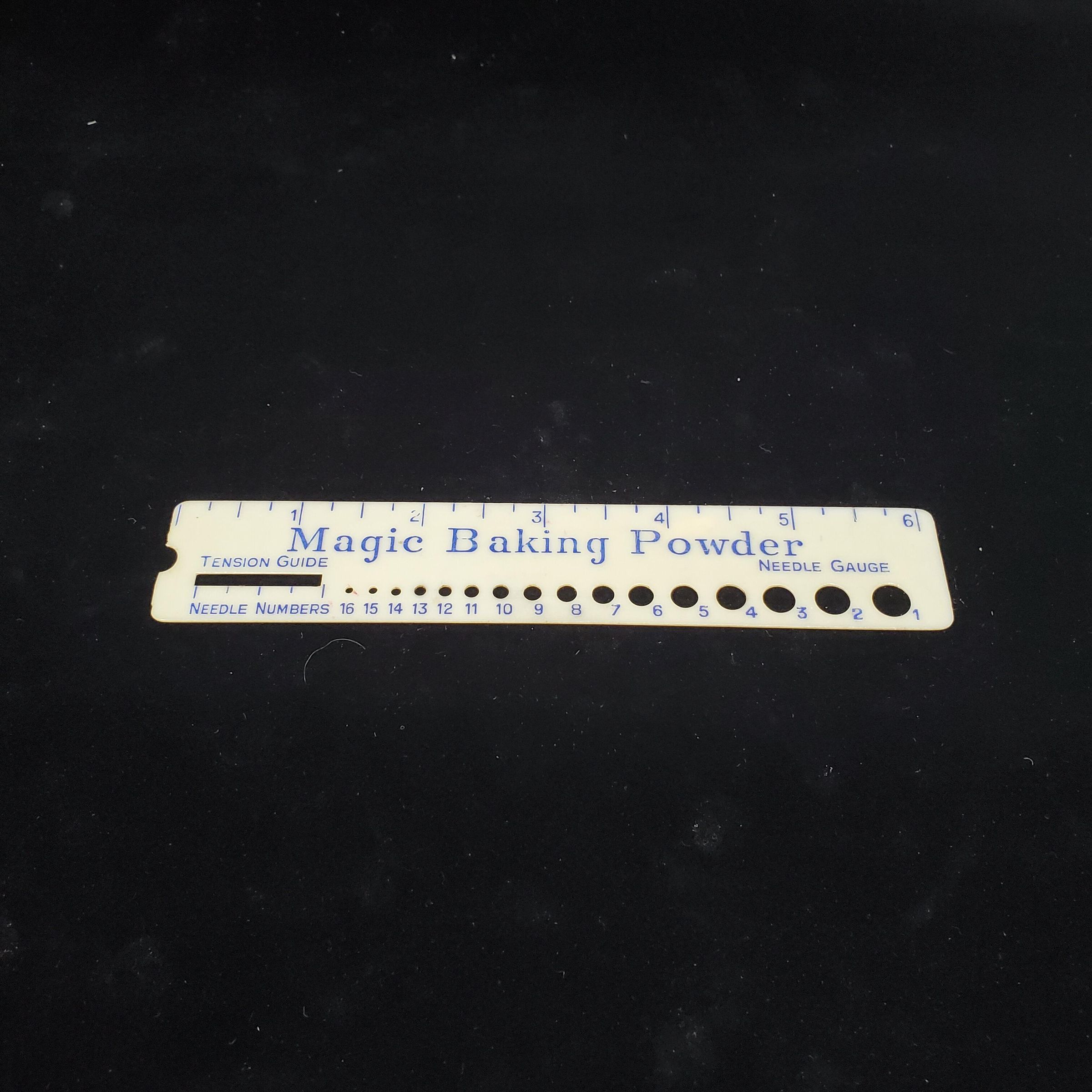 Cream coloured plastic ruler with blue printing. Advertising. Holes of different sizes to measure needles 1 - 16. Tension guide slot also. Advertiser ÒMagic Baking PowderÓ