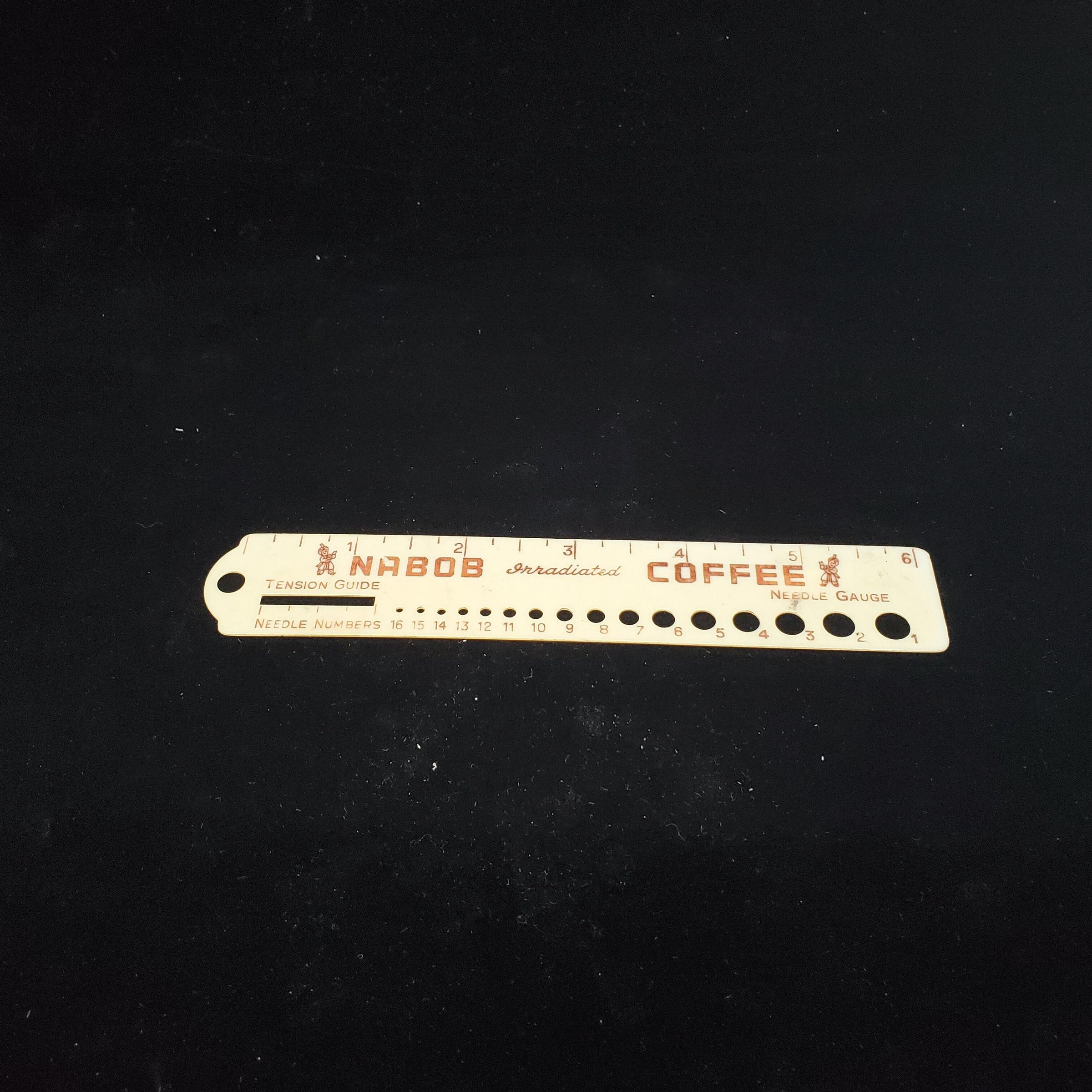 Cream coloured plastic Advertising knitting needle gauge. Reddish-Brown printing advertising ÒNabob Irradiated CoffeeÓ Tension Guide and Needle Gauge. Hole one end for hanging.