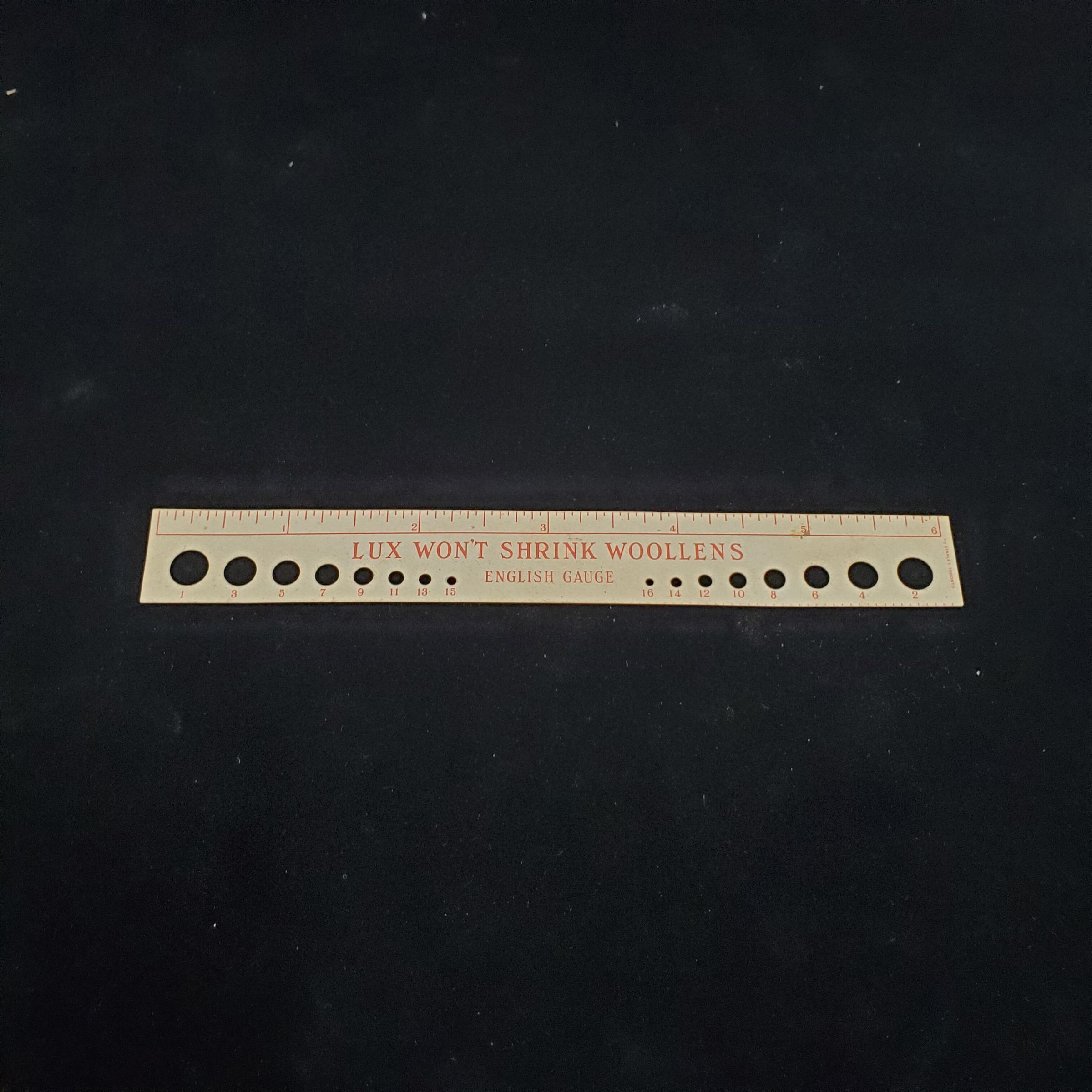 Knitting needle gauge, Advertising. In form of ruler with holes going from1-16. Cream coloured material - not sure what it is - with red printing. Advertising ÒLux WonÕt Shrink WoollensÓ English Gauge also written in red.