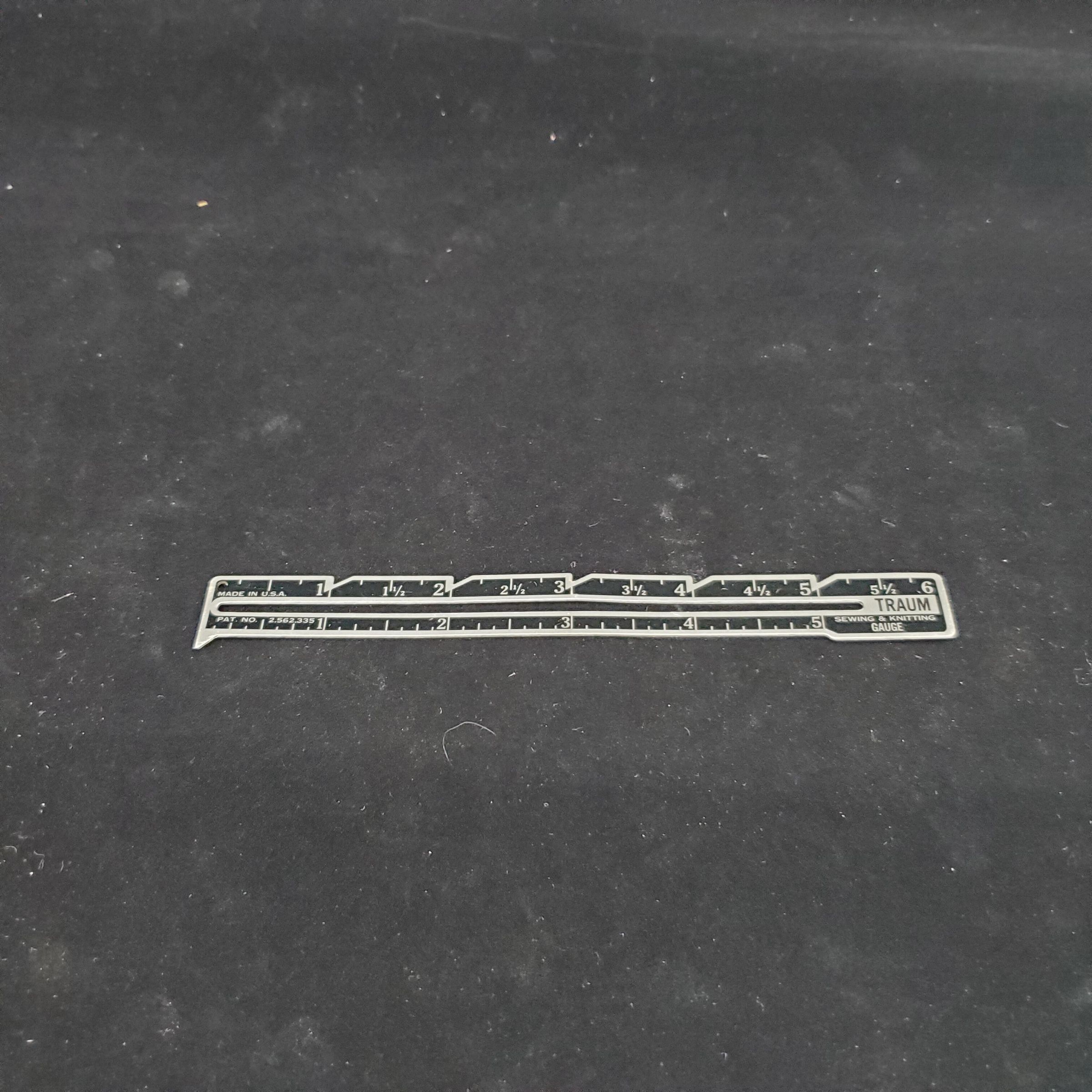 Sewing and Knitting needle gauge, black anf gray metal Notched every nch . Others like this have metal slider - missing here. Inches and CmÕs marked. ÒTraum Made in U.S.A. Pat. no. 2562335Ó.