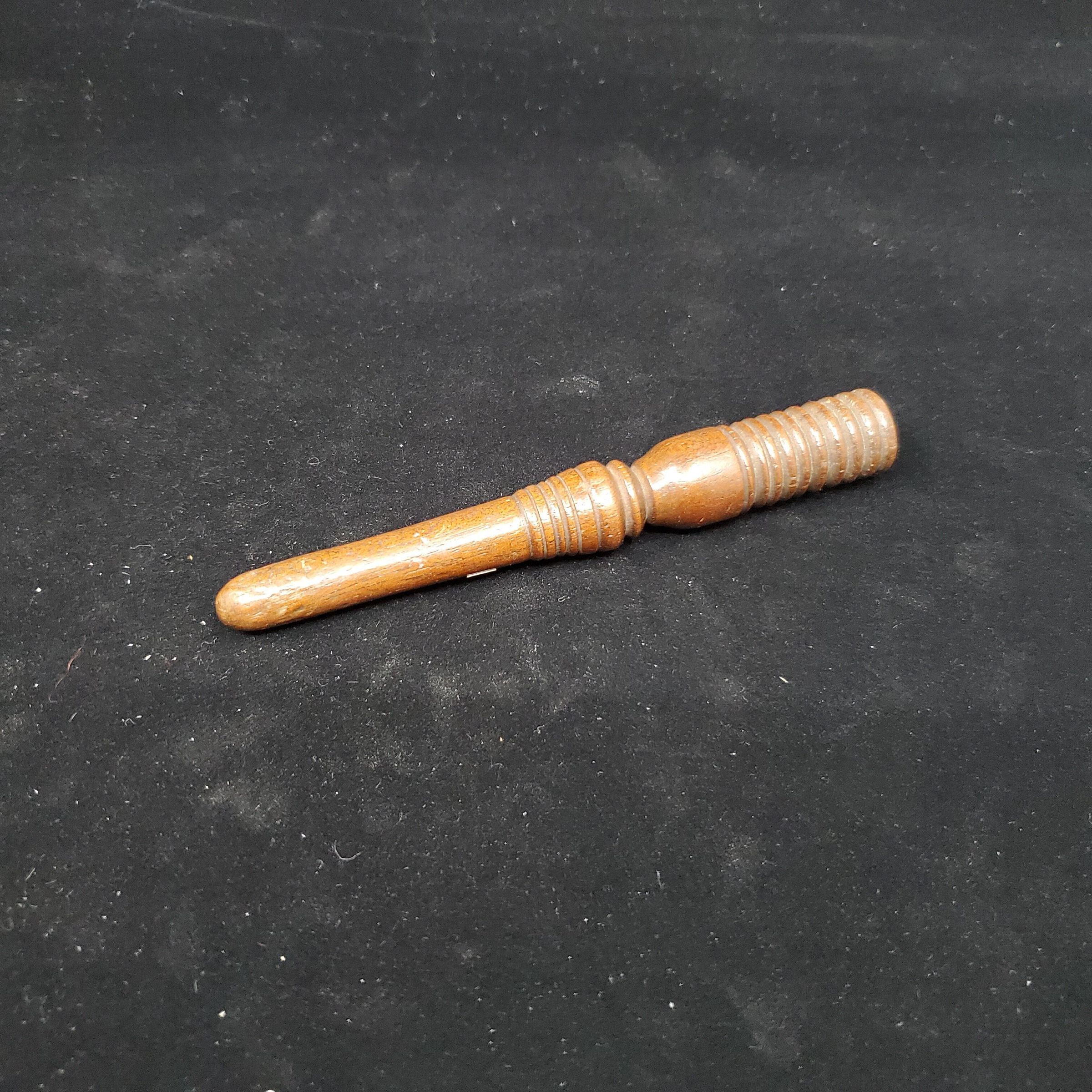 Wooden knitting needle sheath. Dark brown polished wood. Tapered. Design of lined indentations.