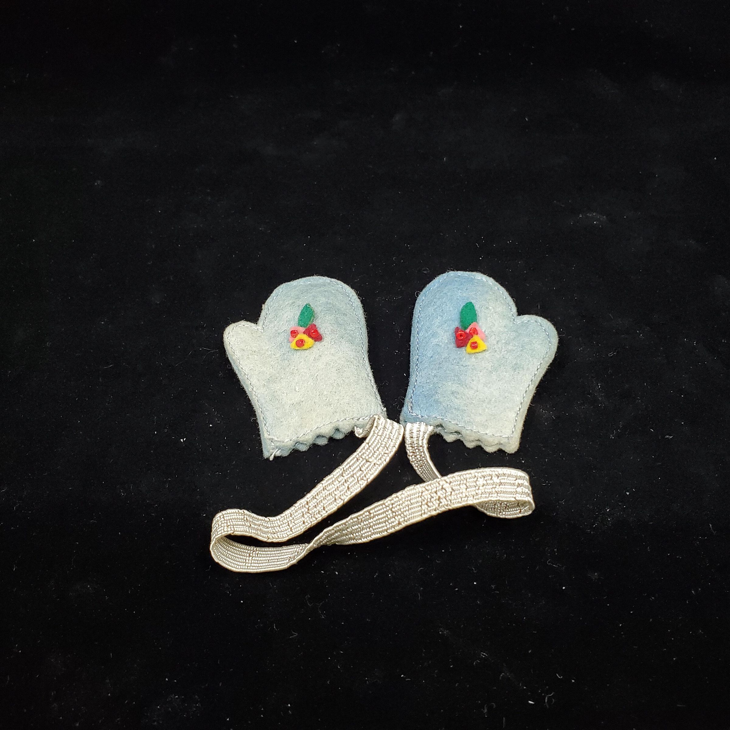 Blue felt knitting needle guards in the shape of mittens. Felt coloured flowers with green leaves added. White worn elastic.