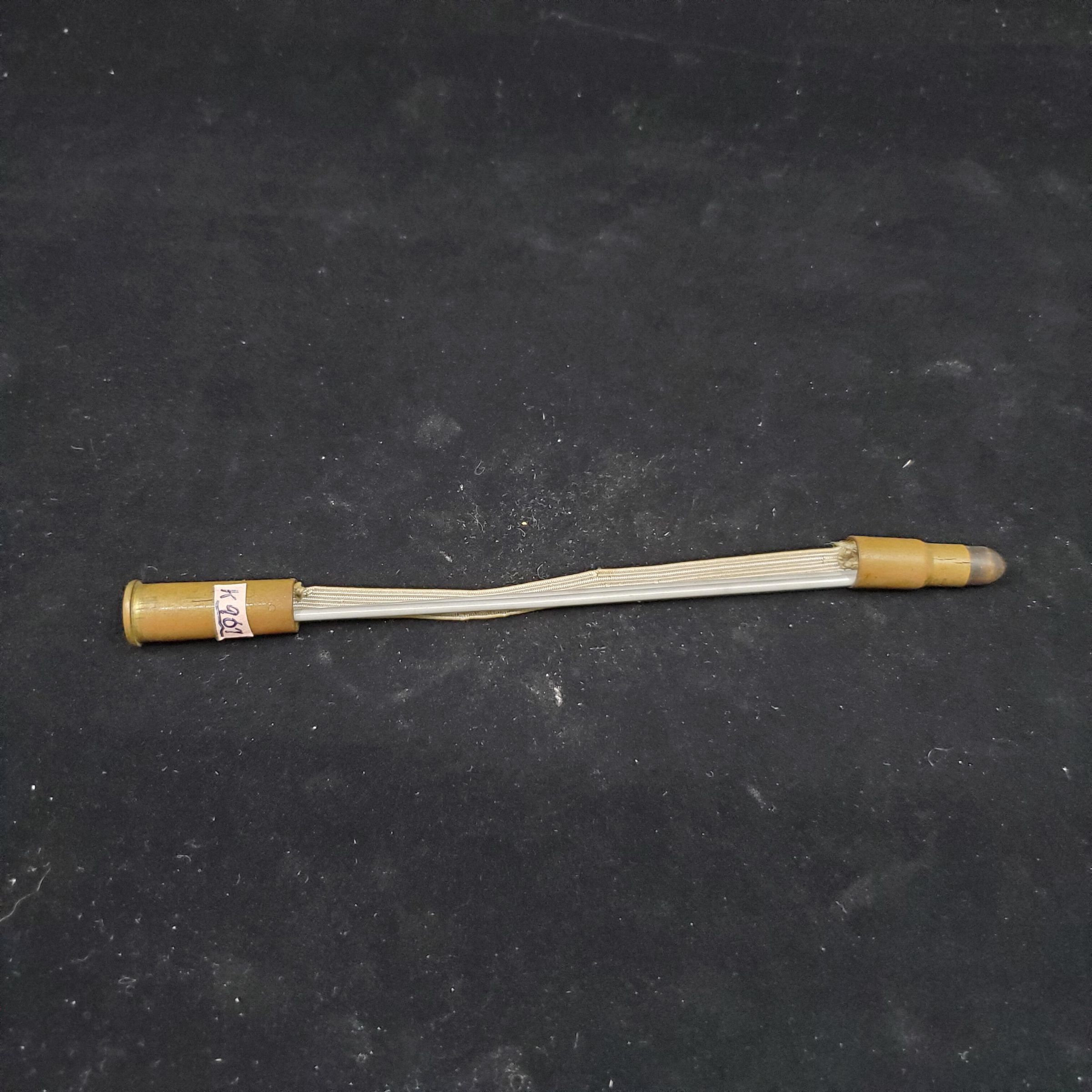 Knitting needle guards made from brass bullet. White elastic stretched betwen and 2 gray aluminum needles in ends. Underneath on case stamped DAC 1919 V!!,