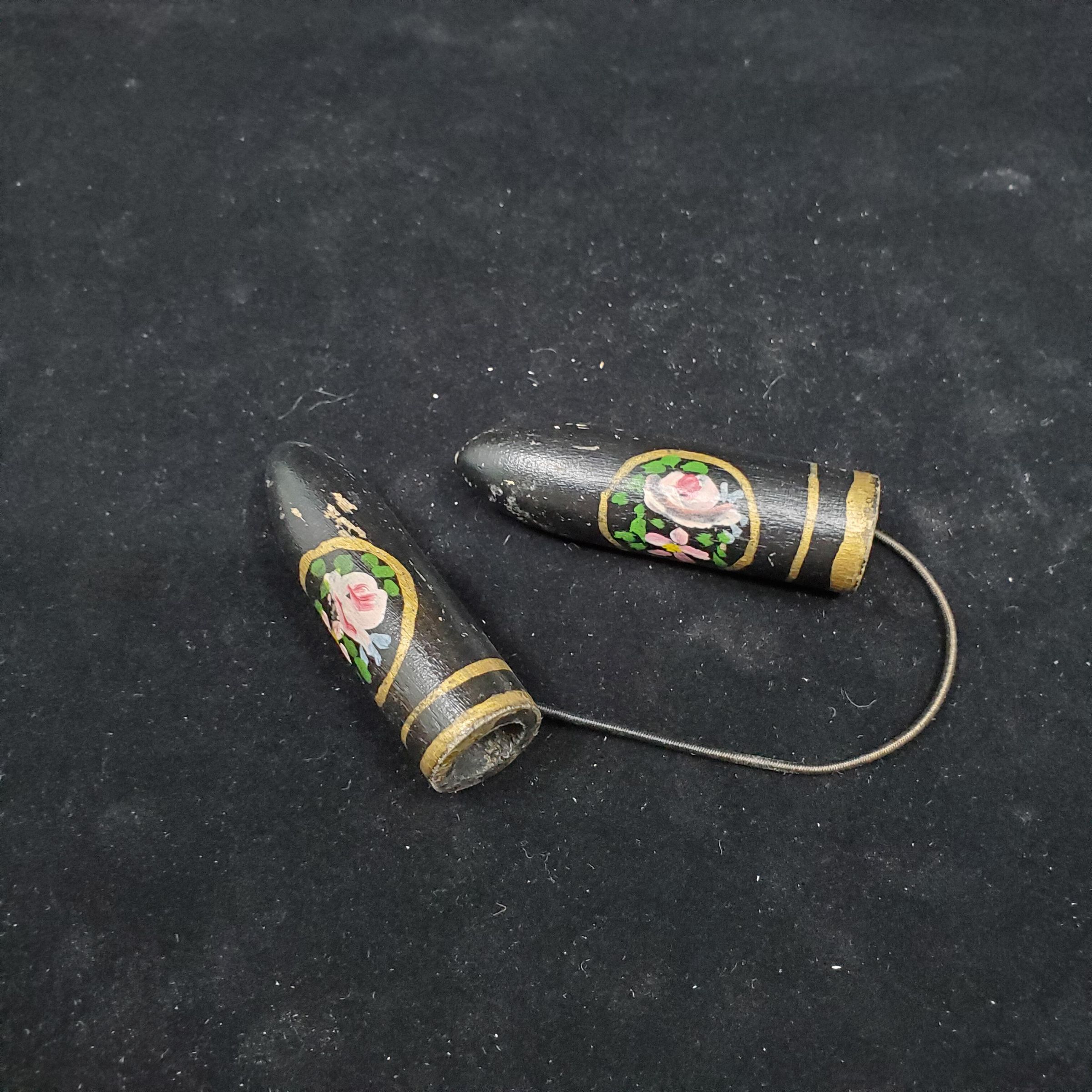 Black painted wooden knitting needle guards. 2 gold lines near top. Painting of flowers, pink, green leaves, inside a gold circle.Pointed end. Hole near top for joining.Black cord elastic joining proably not original.