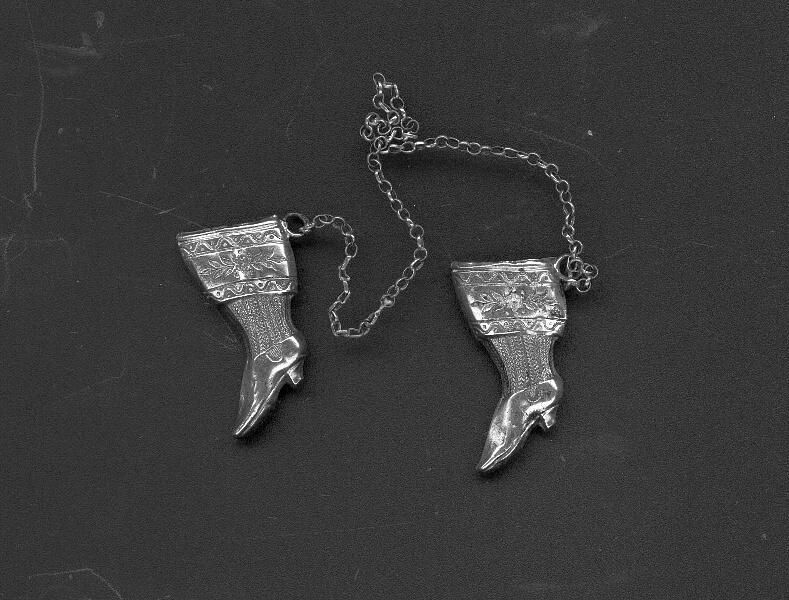 Knitting Needle Guards in the shape of a high boot. Wide band of pattern at top narrowing to body with plain heeled shoe. Long silver chain .Marks on on the solid circle of the chain - not clear but looks like 750 with an M.