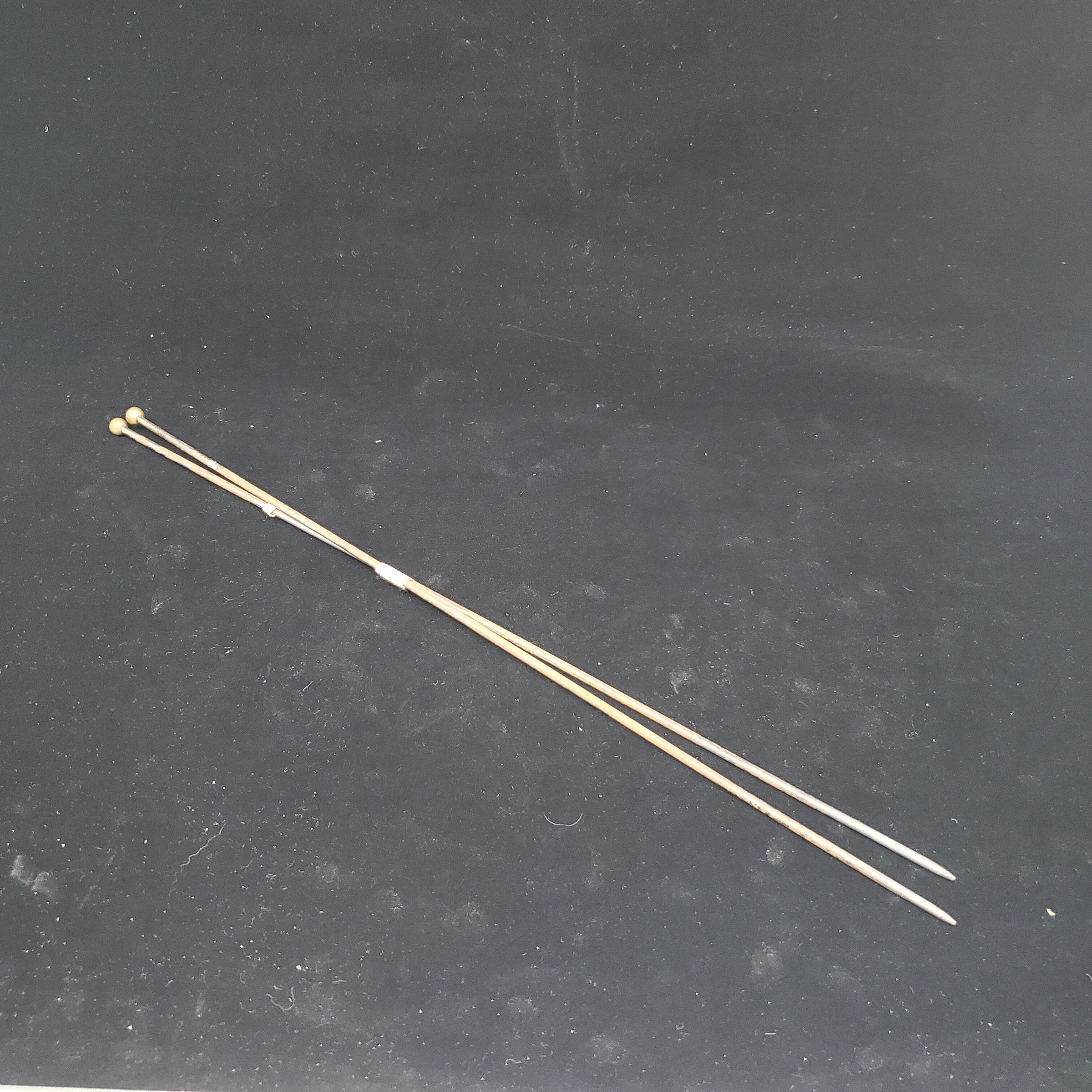 Steel knitting needles with brass nobs on top. No size or maker.Badly rusted .